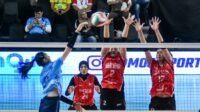 Pevoli Syelomitha (kiri) melakukan smes yang berusaha dihalau pevoli Vara (tengah) dan Maya Indri (kanan) […]
