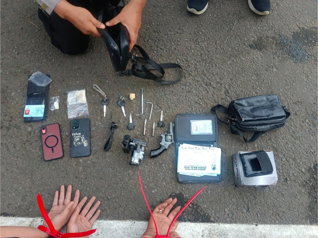 “Dari tangan pelaku kami mengamankan sejumlah barang bukti, antara lain kunci letter T, kunci L, pistol mainan, dua unit sepeda motor, serta beberapa kunci kontak dan telepon genggam. Modus yang digunakan adalah merusak kunci kontak kendaraan,” jelas Kompol Rabiin.