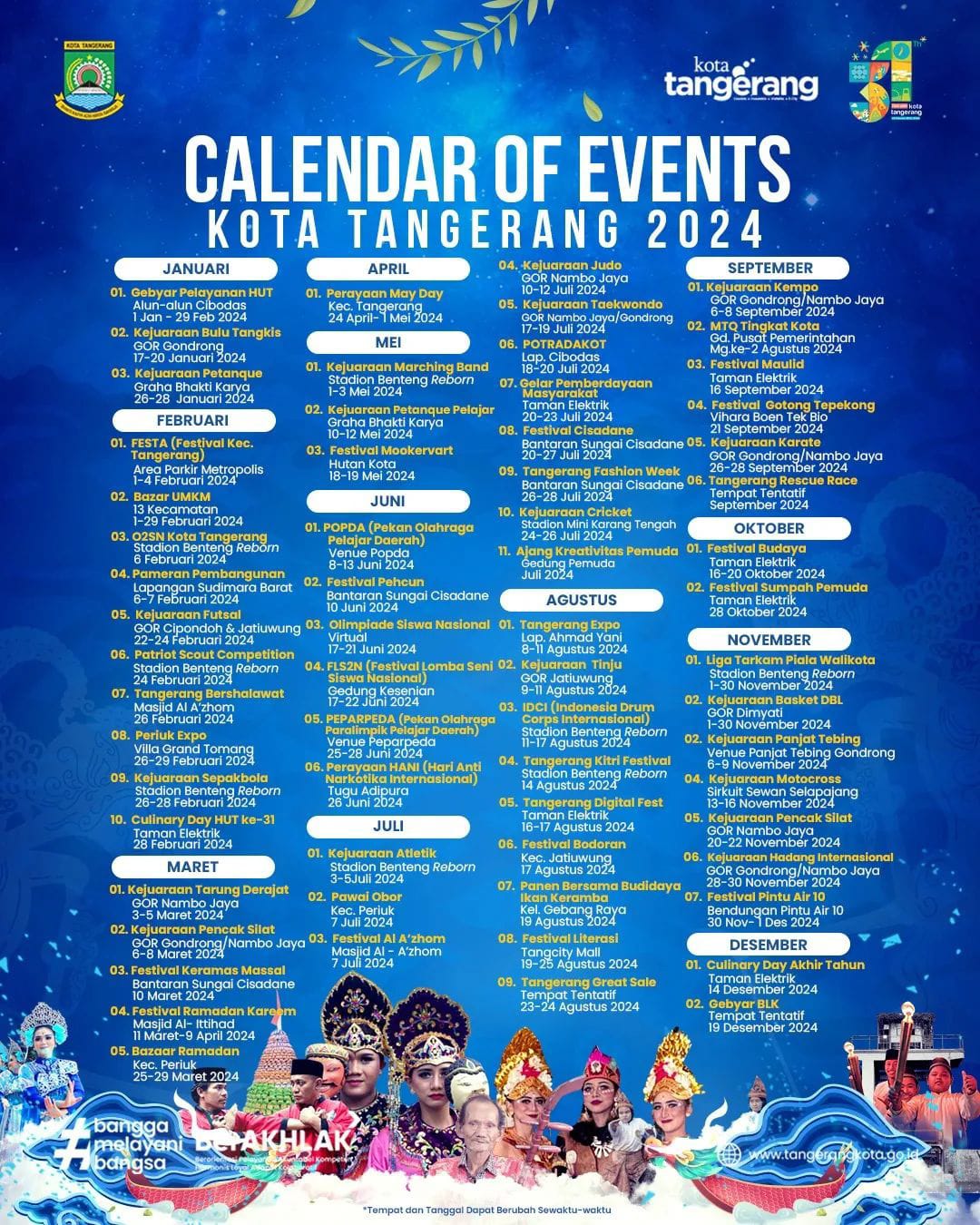 Dalam Calendar of Events 2024, masyarakat dapat menemukan daftar lengkap kegiatan yang diselenggarakan oleh Pemerintah Kota Tangerang sepanjang tahun. Mulai dari acara budaya, festival seni, olahraga, pendidikan, hingga kegiatan komunitas, semuanya terangkum dalam satu platform yang mudah diakses.