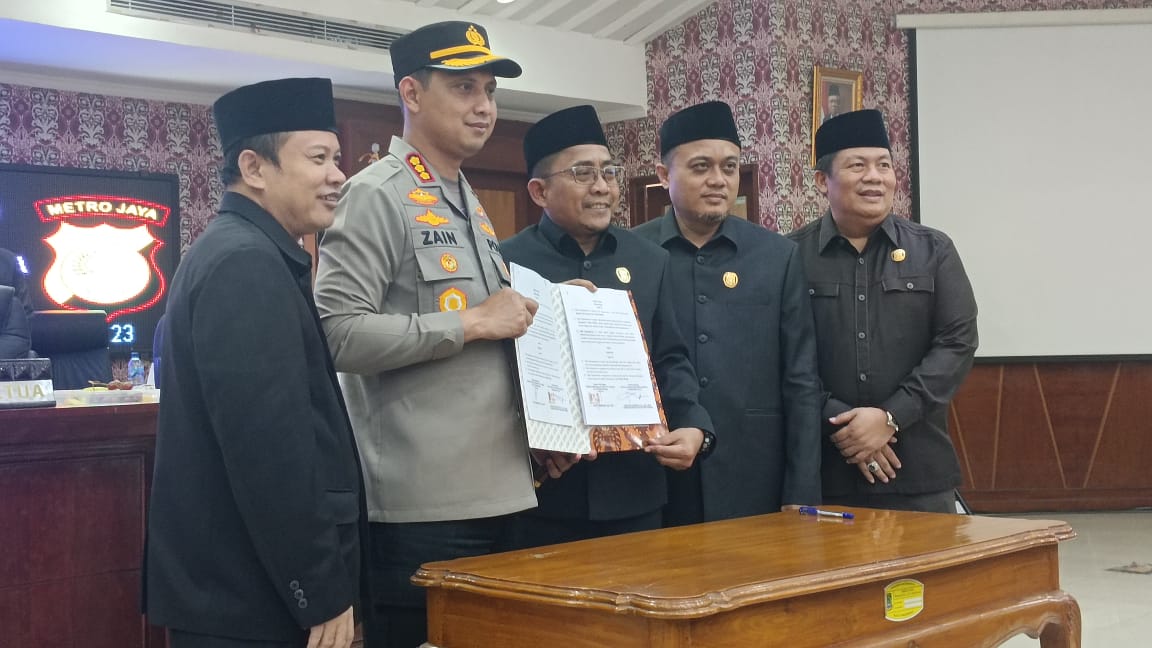 KOTA TANGERANG, LENSABANTEN.CO.ID – DPRD Kota Tangerang melaksanakan tanda tangan nota kesepahaman kerjasama dengan Polres Metro Tangerang Kota. Penandatangan kerjasama tersebut dilakukan oleh Ketua DPRD Kota Tangerang Gatot Wibowo serta Kapolres Metro Tangerang Kota Kombes Pol Zain Dwi Nugroho di gedung DPRD Kota Tangerang, Selasa 18 Juli 2023.