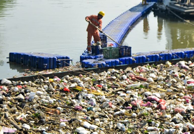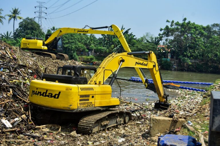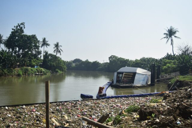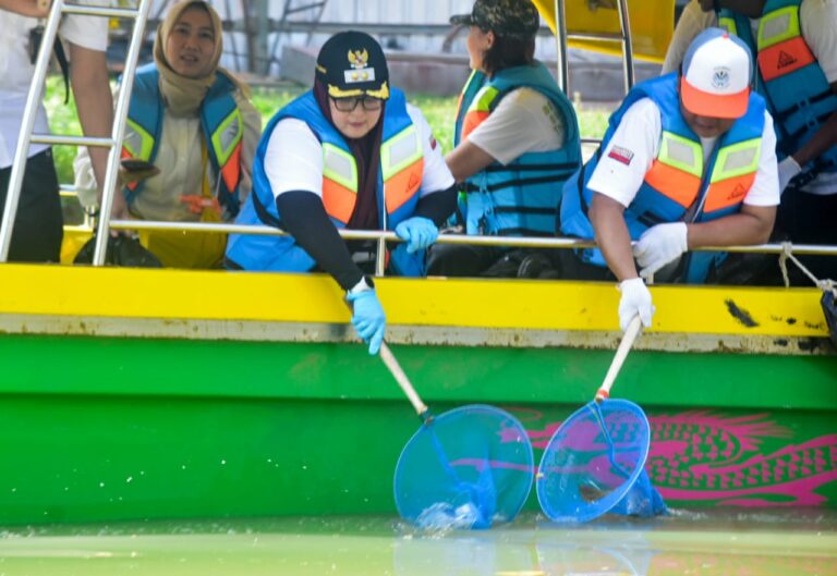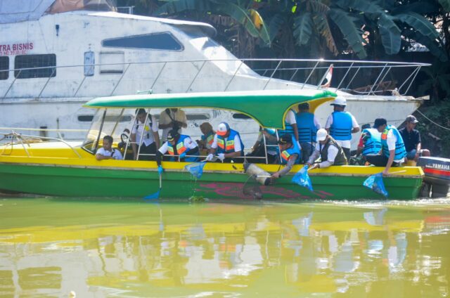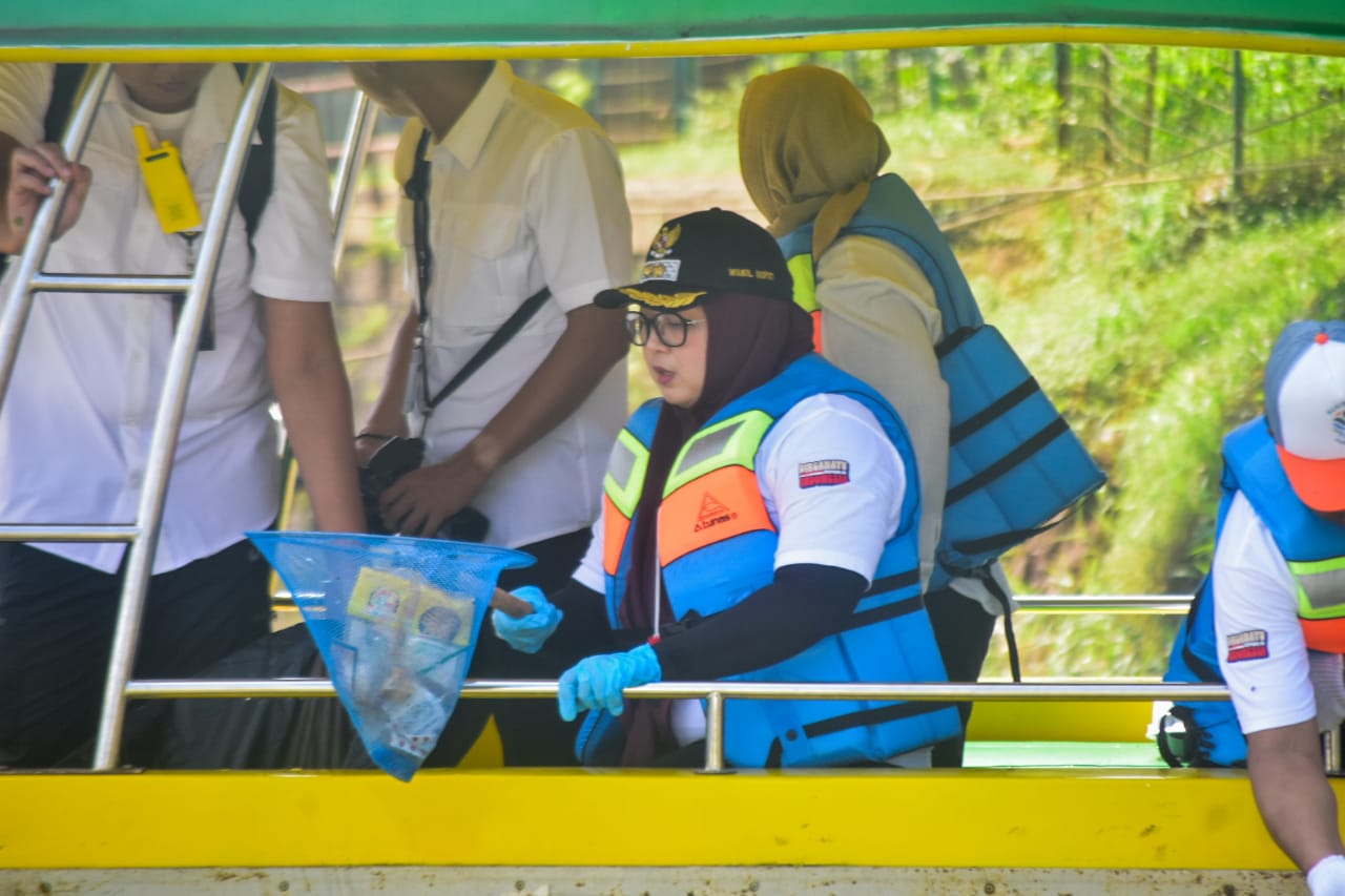 Wakil Bupati Tangerang Intan Nurul Hikmah mengambil sampah saat aksi Bersih Satu Bumi Merdeka dari Sampah di aliran Sungai Cisadane, Desa Tanjung Burung, Kabupaten Tangerang, Banten, Rabu (27/8/2025). Dinas Lingkungan Hidup dan Kebersihan Kabupaten Tangerang bersama organisasi lingkungan serta relawan menggelar aksi membersihkan Sungai Cisadane sebagai upaya menjaga kesehatan ekologi sungai dan mengurangi jumlah sampah yang terbawa arus ke laut. Foto : Ilham Herda Fauzi/LENSABANTEN