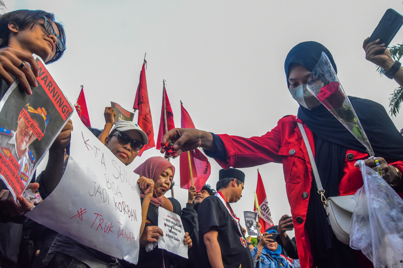Mahasiswa menaburkan bunga saat aksi solidaritas korban truk tanah di Tugu Tigaraksa, Kabupaten Tangerang, Banten, Kamis (17/10/2024) sore.