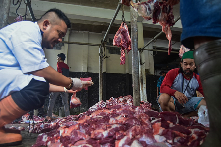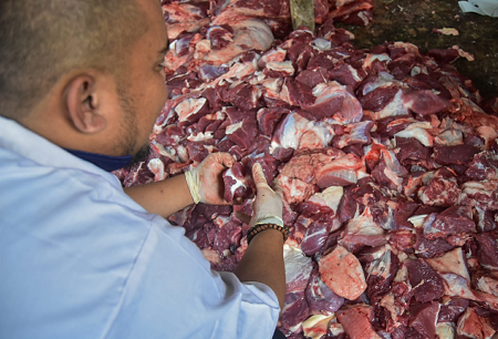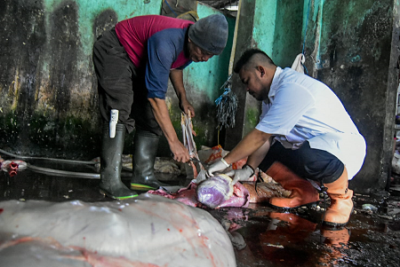 Petugas Dinas Ketahanan Pangan Kota Tangerang memeriksa daging sapi qurban setelah disembelih di UPTD Rumah Pemotongan Hewan (RPH) Kota Tangerang, Banten, Jumat (06/06/2025). Dinas Ketahanan Pangan Kota Tangerang melakukan pemeriksaan daging hewan qurban tersebut dilakukan guna menjamin daging kurban layak dan aman konsumsi bagi masyarakat. Foto : Ilham Herda Fauzi/LENSABANTEN