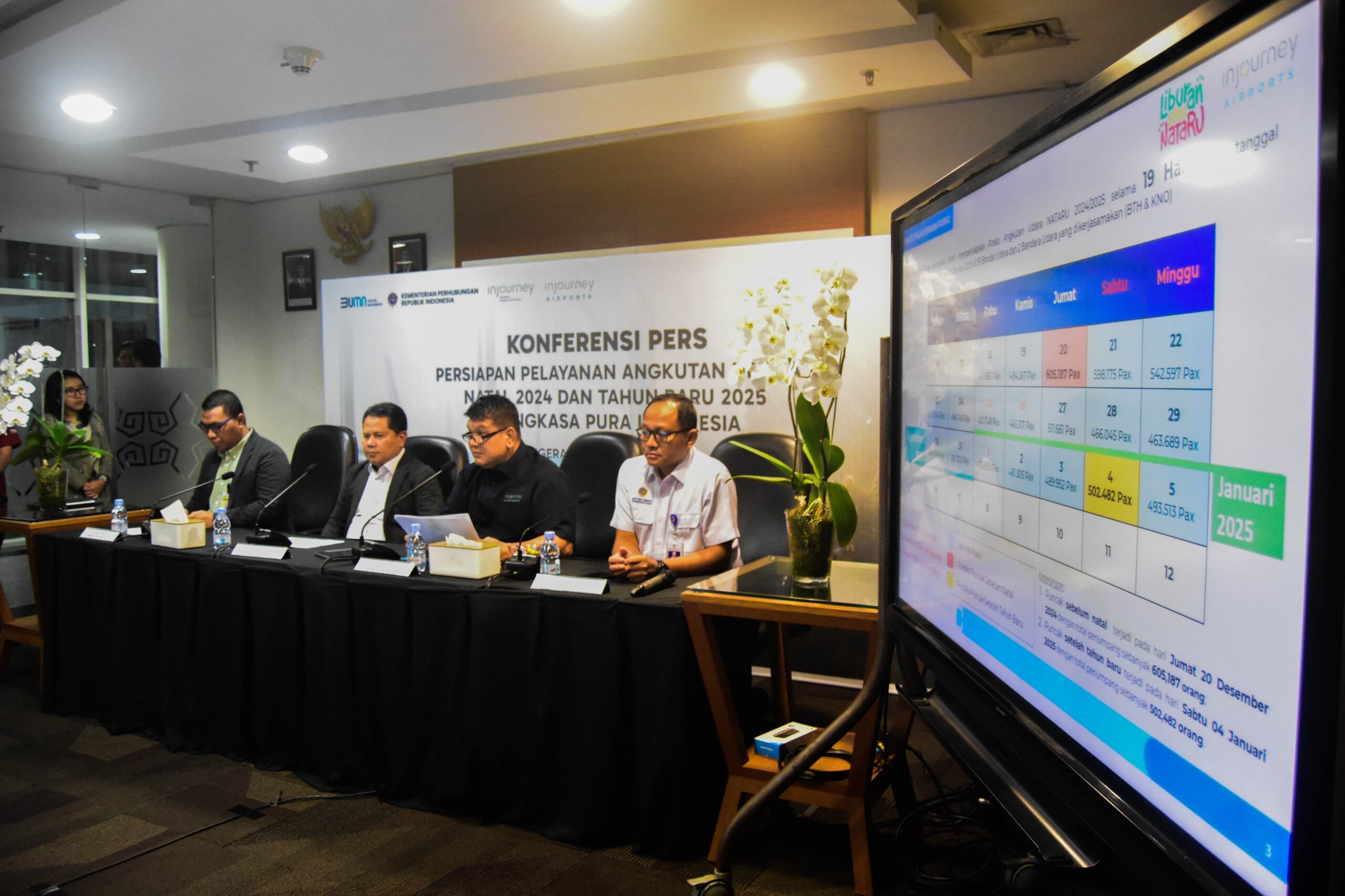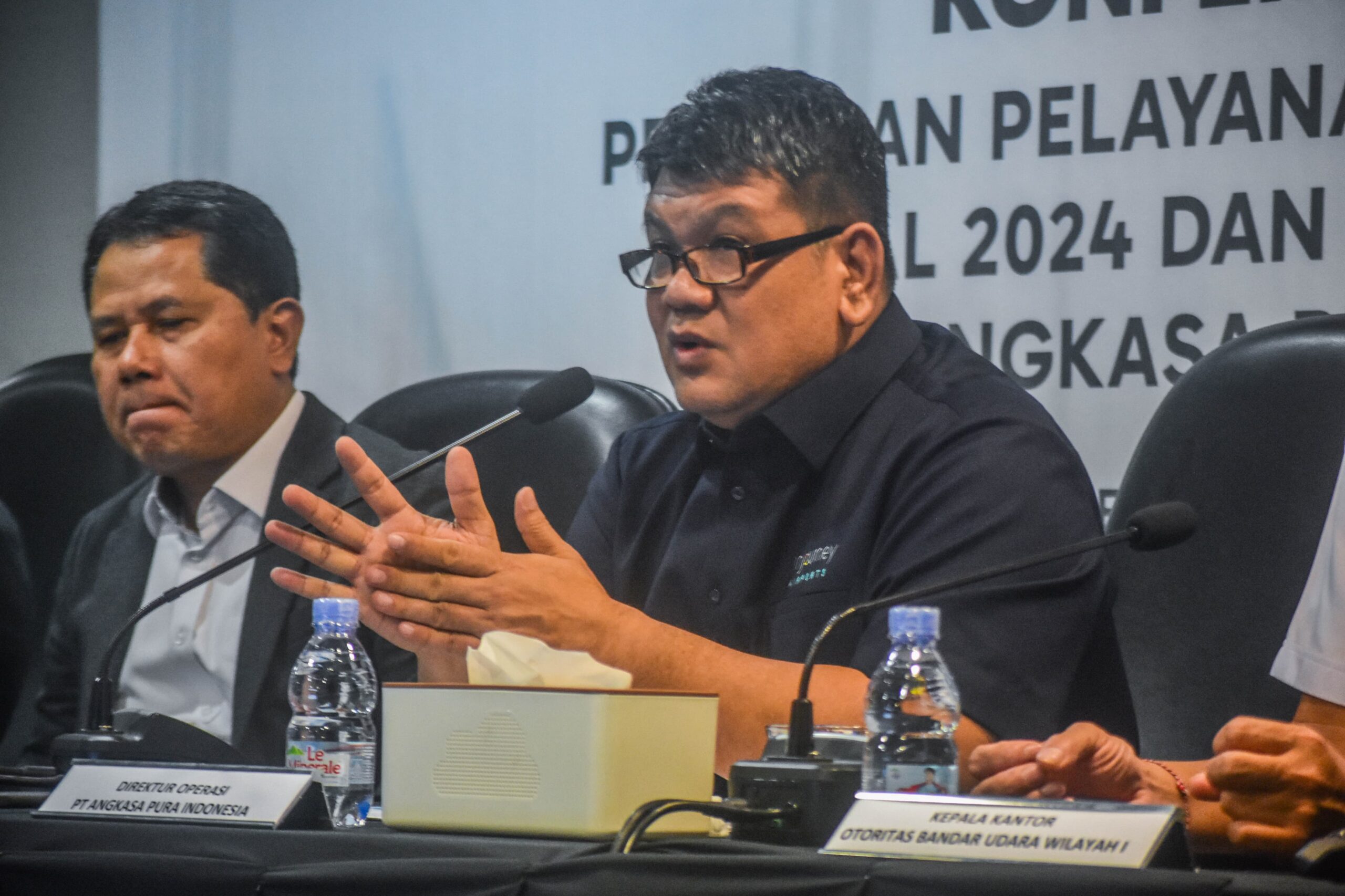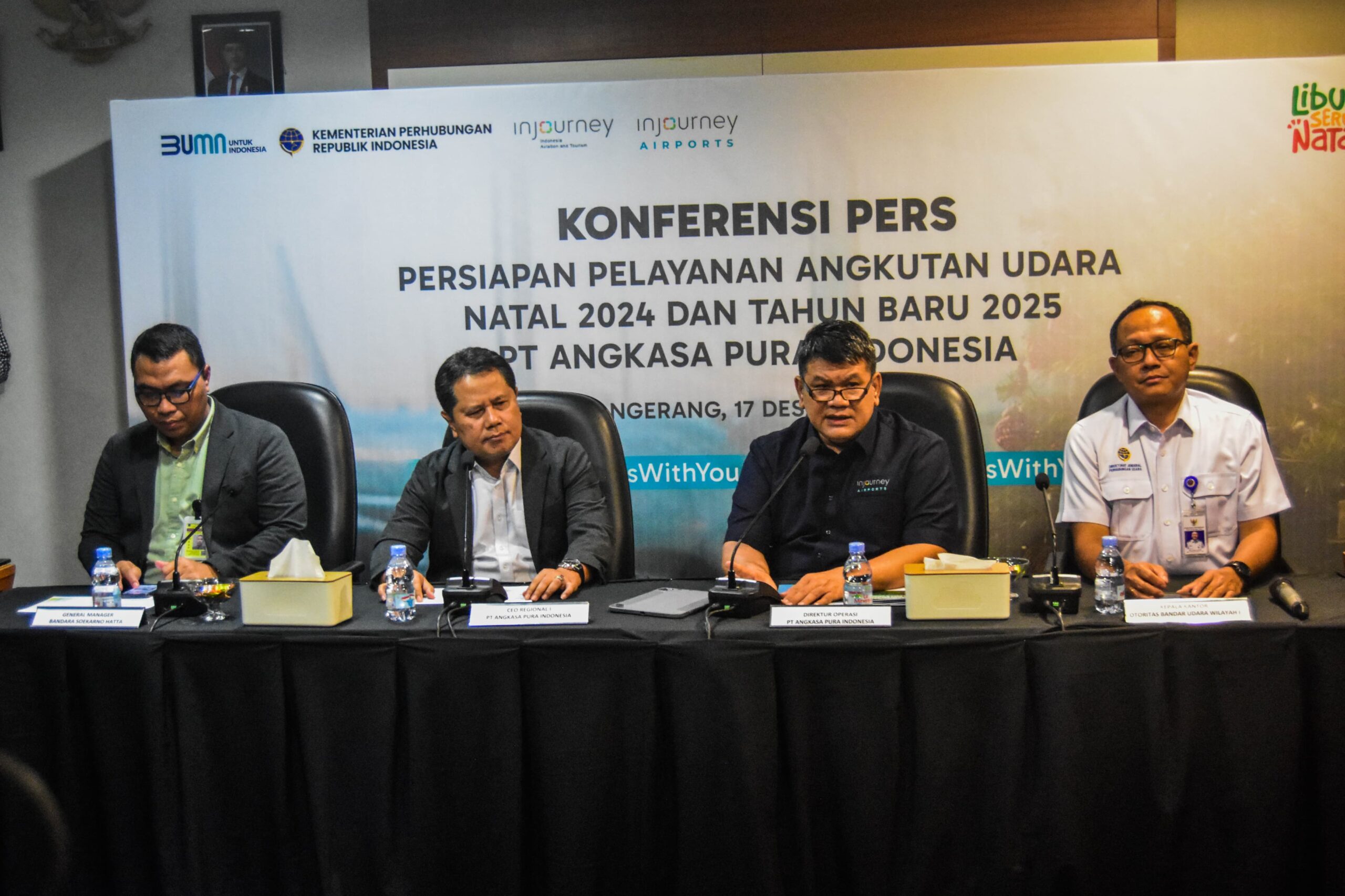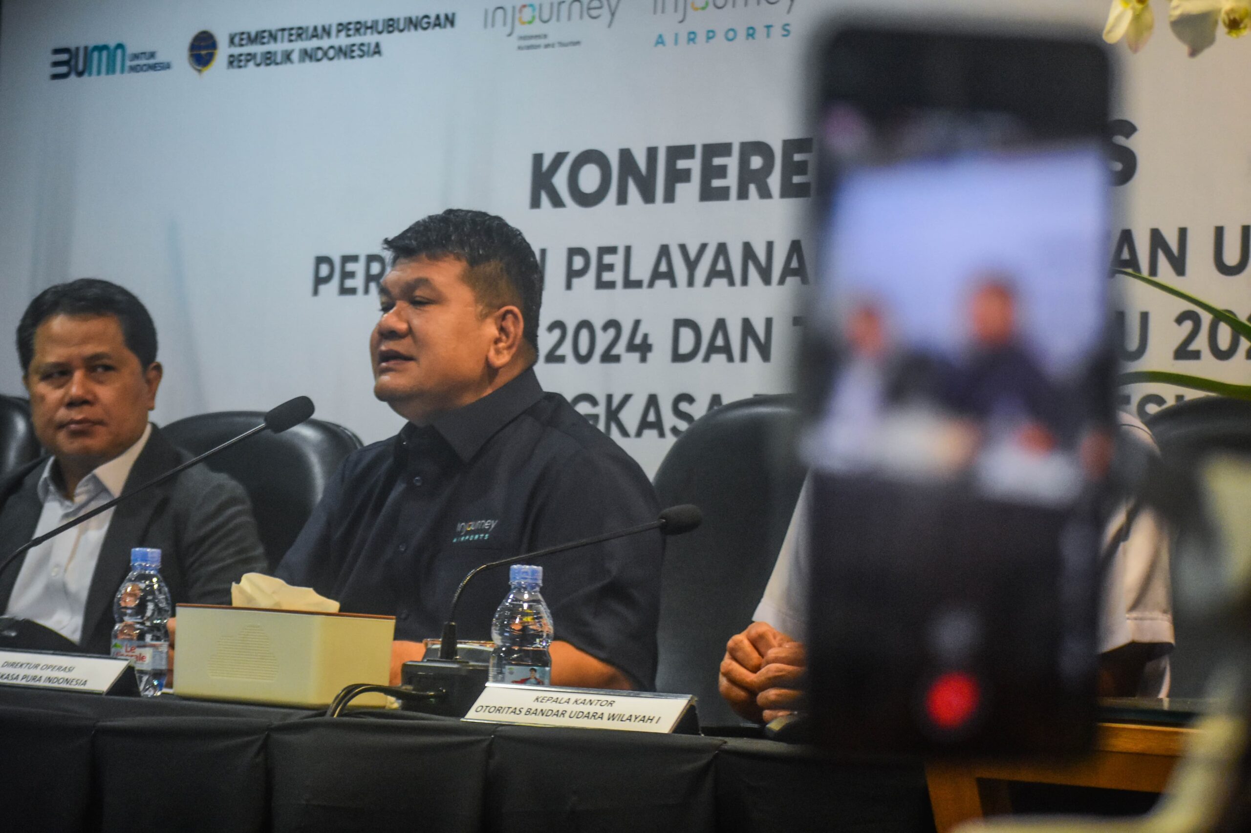 Direktorat Operasi PT. Angkasa Pura Indonesia Wendo Asrul Rose memaparkan pembukaan posko Nataru dan mulainya masa angkutan Nataru saat konferensi pers di Gedung Injourney Airport Center, Bandara Soekarno-Hatta, Kota Tangerang, Banten, Selasa (17/12/2024).