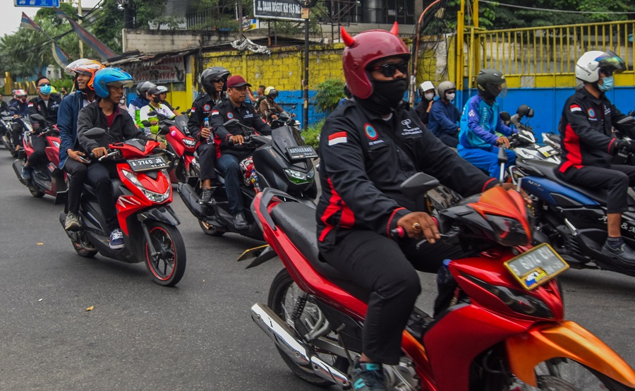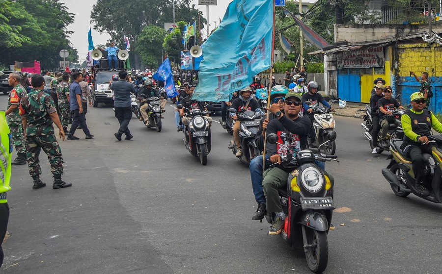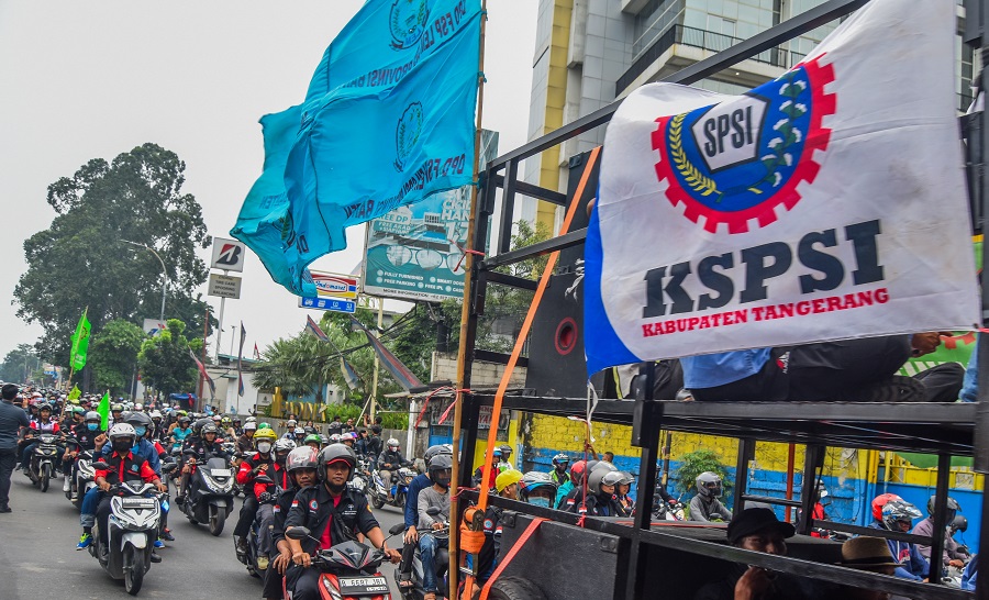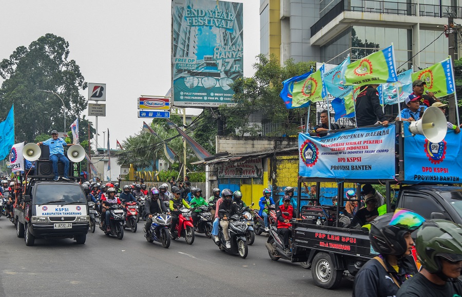 Ratusan buruh dari elemen KSPSI Tangerang Saat berangkat menuju Jakarta dalam memperingati hari Buruh se-Dunia May Day di Jln, Dan Mogot, Kota Tangerang, Banten, Rabu (01/05/2024). Ratusan buruh dari Tangerang menuntut salah satunya mengenai Undang – undang Ciptakerja Nomor 6 Tahun 2023 yang di anggap tidak memihak kepada kaum buruh. Foto : Ilham herda Fauzi/LENSABANTEN