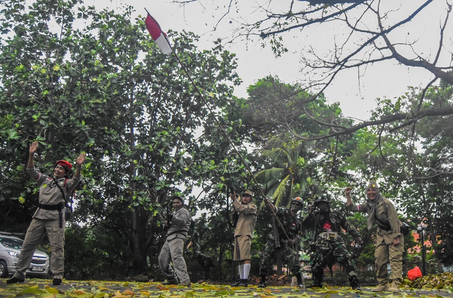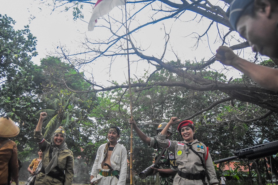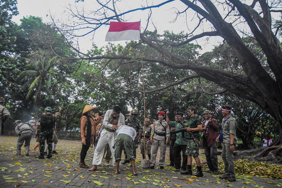 Sejumlah anggota komunitas sepeda ontel Kota Tangerang memainkan teaterikal di Taman Makan Pahlawan (TMP) Taruna, Kota Tangerang, Banten, Minggu (10/11/2024). Memperingati Hari Pahlawan komunitas sepeda ontel Kota Tangerang mengelar acara goes bareng dan teatrikal tentang perjuangan para pahlawan, dalam mengenang para pahlawan Indonesia. Foto : Ilham Herda Fauzi/LENSABANTEN