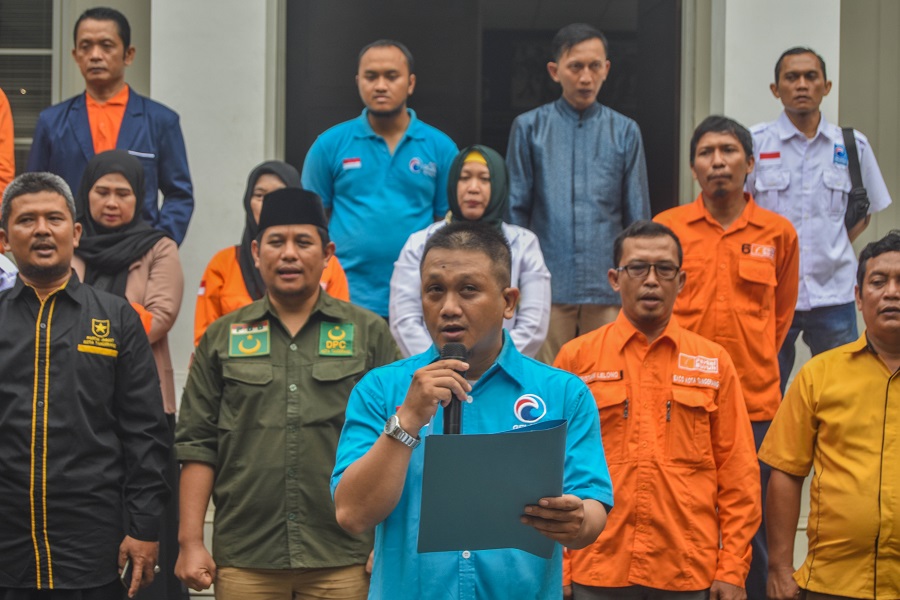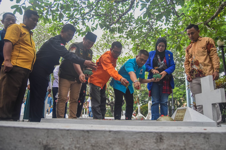 Koalisi Non Parlemen Bersatu (KNPB) merupakan gabungan partai Politik yang gagal masuk keparlemen Kota Tangerang melakukan Deklarasi dan Tabur bunga di makam pahlawan di momen hari lahirnya Pancasial. 8 partai yang tergabung dalam KNBP seperti Partai Gelora, Partai Hanura, Partai Bulan Bintang, Partai Buruh, Partai Garuda, Partai Pkn, Partai Prima, Partai Ummat. Foto : Ilham Herda Fauzi/LENSABANTEN