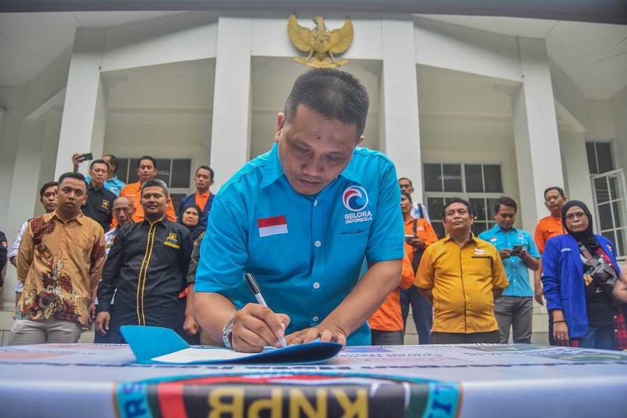 Sejumlah Para ketua partai yang tergabung di KNPB mentanda Tangani Teks Deklarasi KNPB di Taman Makam Pahlawan Kota Tangerang, Banten, Sabtu (01/06/2024).