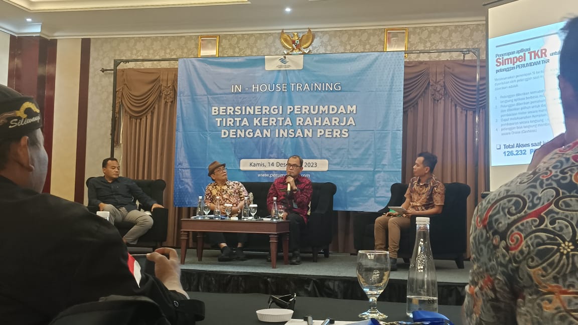 Direktur Utama Perumdam Tirta Kerta Raharja Kabupaten Tangerang Sofyan Sapar (memegang mik) saat menyamapaikan paparannya bersama Rustam FachriTim Analis Komisi Pengaduan dan Penegakan Etika Pers (kedua kiri) dan Ketua PWI Kabupaten Tangerang Sri Mulyo serta Sekretaris PWI Kabupate Tangerang Muhammad Romly, Kamis 14 Desember 2023. Kegiatan In House Training ini digelar dengan mengusung tema Bersinergi Perumdam Tirta Kerta Raharja dengan Insan Pers guna menguatkan sinergitas dan kolaborasi. Foto : Eky Fajrin/ Lensabanten