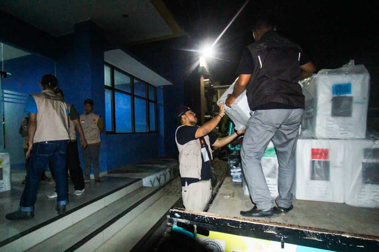 Sejumlah anggota PPS mendistribusikan logistik kotak suara dan surat suara ke tempat-tempat TSP di wilayah Kelurahan Nambo, Kecamatan Karawaci, Kota Tangerang, Banten, Selasa (13/02/2024) Malam.