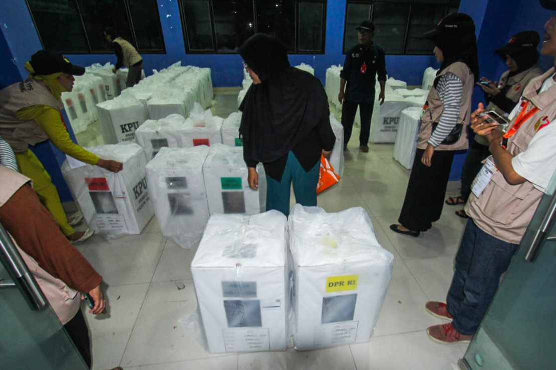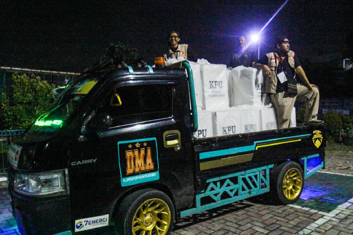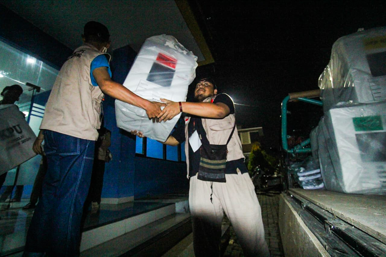 Sejumlah anggota PPS mendistribusikan logistik kotak suara dan surat suara ke tempat-tempat TSP di wilayah Kelurahan Nambo, Kecamatan Karawaci, Kota Tangerang, Banten, Selasa (13/02/2024) Malam. Sekitar kelurahan nambo bertotal 21 TPS, dengan pengawasan ketat dari petugas gabungan. dan jadwal penyoblosan mulai dari 07:00 WIB sampai 13:00 WIB. Foto : Ilham Hendra Fauzi/LENSABANTEN