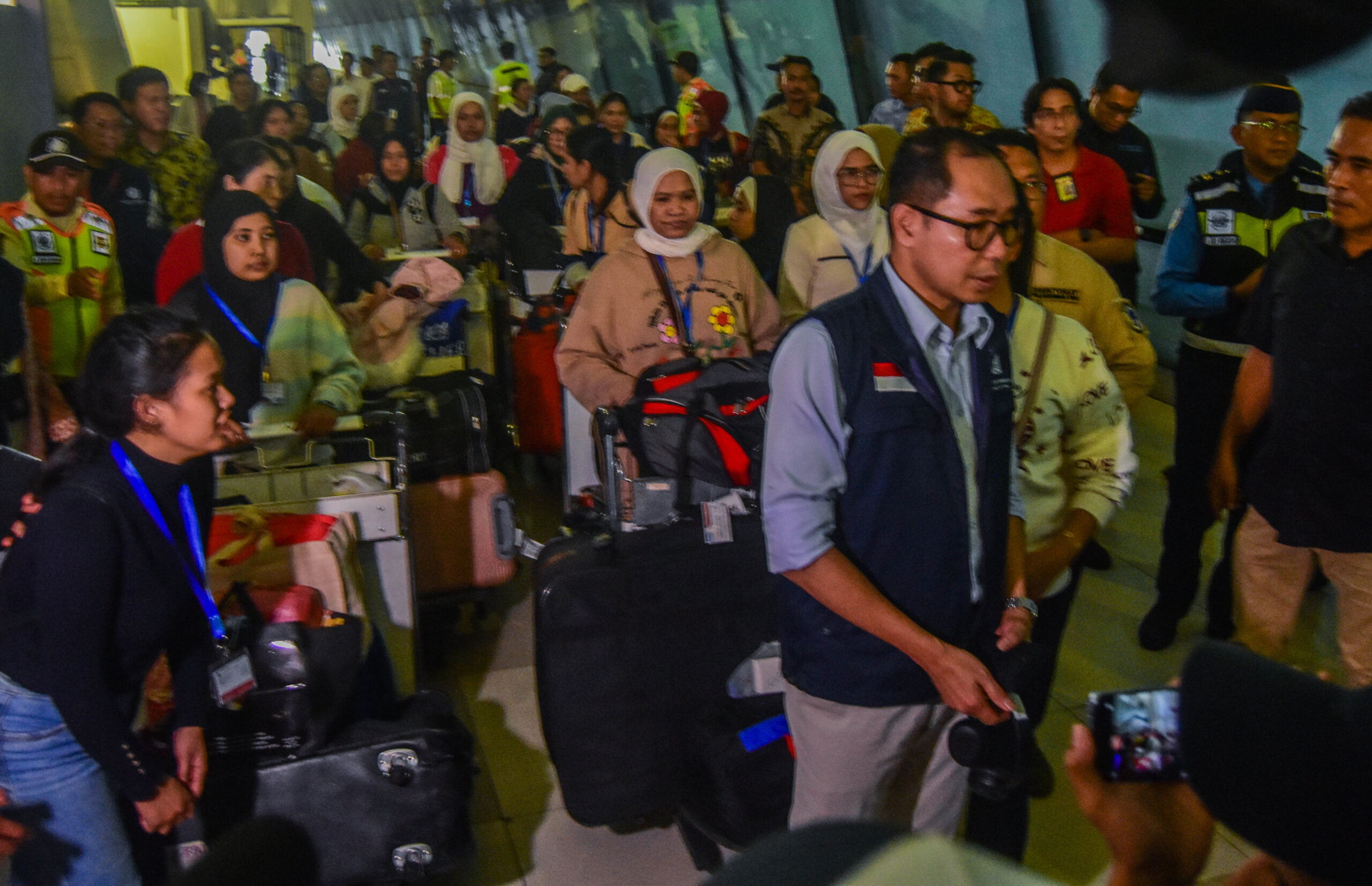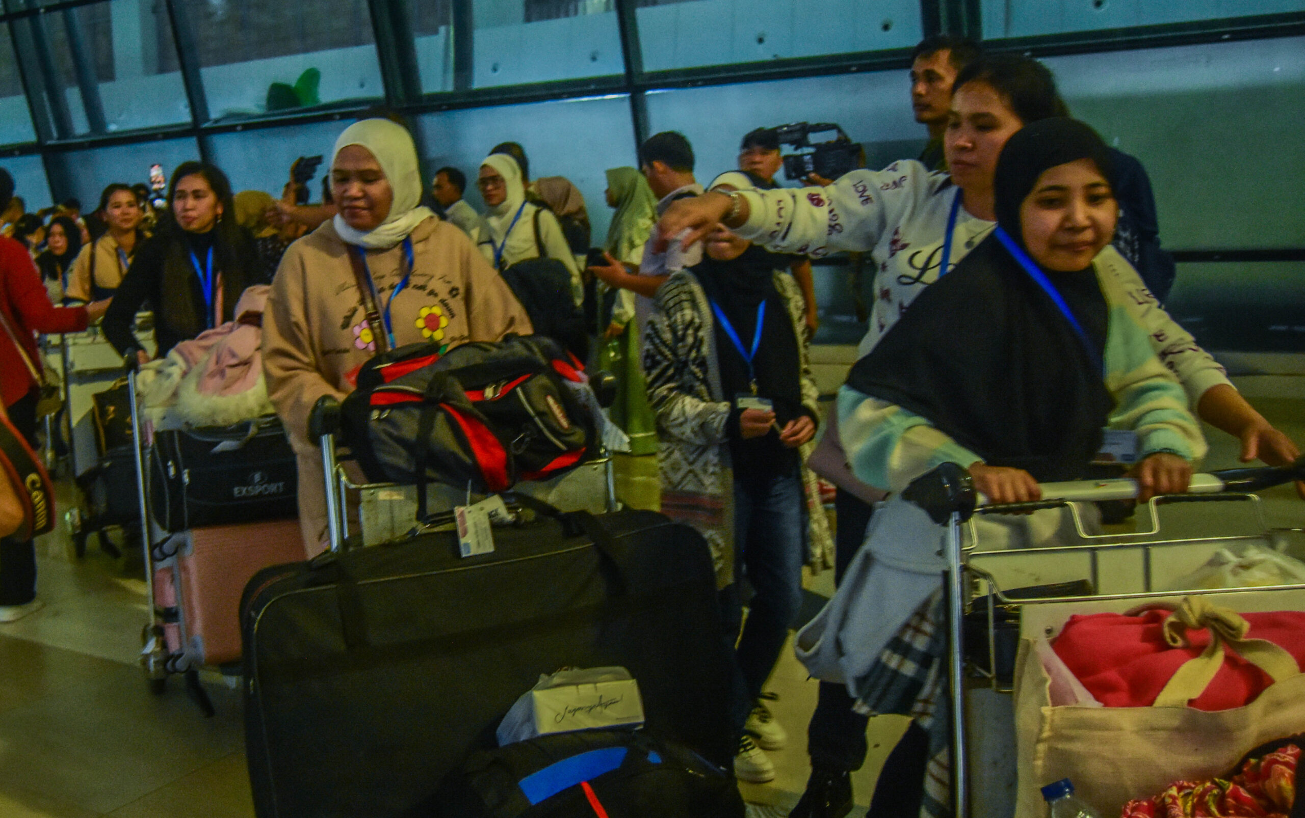 Sejumlah Warga Negara Indonesia (WNI) yang dipulangkan dari Suriah menuju pintu keluar setibanya di Terminal 3 Bandara Soekarno Hatta, Kota Tangerang, Banten, Kamis, (12/12/2024). Kementrian Luar Negeri (Kemlu) RI mengevakuasi sebanyak 37 Warga Negara Indonesia dari Suriah imbas peralihan kekuasaan di suriah dari rezim Bashar Al-Assad kepada kelompok pemberontak Abu Mohammed Al Julani. Foto : Ilham Herda Fauzi/LENSABANTEN