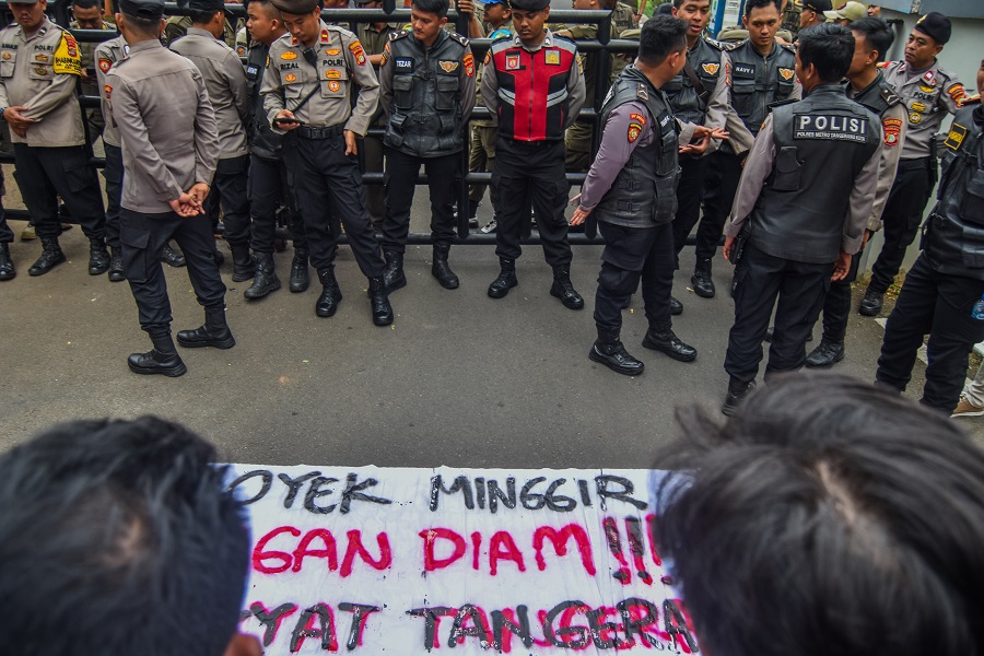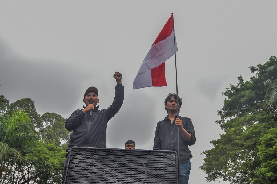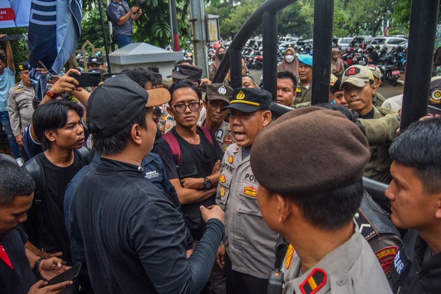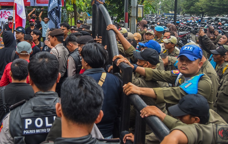 Elemen masyarakat menamakan diri fraksi rakyat Tangerang menyampaikan aspirasi di depan gedung Pemerintahan Kota Tangerang, Banten, Kamis (25/04/2024). Fraksi rakyat Tangerang, mahasiswa dan pemuda menggugat menggelar aksi copot Kepala Dinas PUPR kota Tangerang di 3 lokasi. Dengan 3 Gugatan salah satunya dugaan terjadinya unsur KKN di lingkup Dinas PU, adanya mafia proyek yang membagi – bagi paket kegiatan dan monopoli paket kegiatan. Fot : Ilham Herda Fauzi/LENSABANTEN