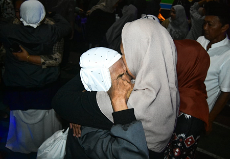 Seorang haji lansia dituntut oleh petugas di Asrama Haji Cipondoh, Kota Tangerang, Banten, Kamis (12/06/2025) malam.