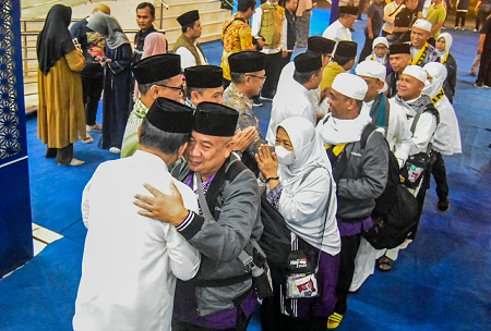 Sebanyak 391 haji asal Provinsi Banten rombongan kelompok terbang (kloter) 1 tiba di darat usai melaksanakan ibadah haji di Arab Saudi. Foto : Ilham Herda Fauzi/LENSABANTEN