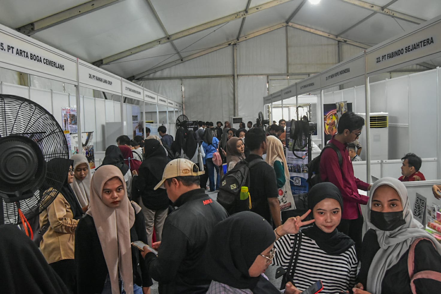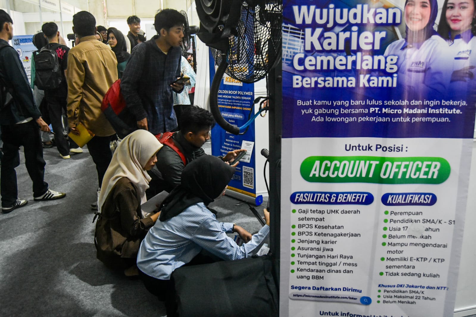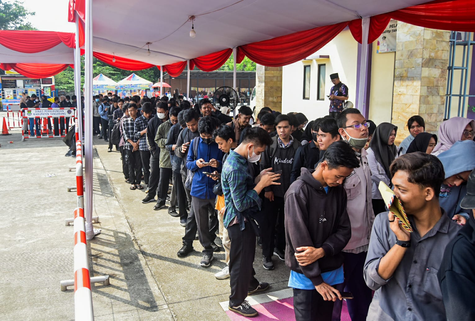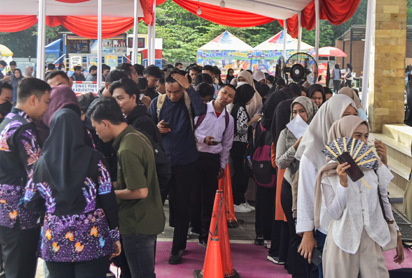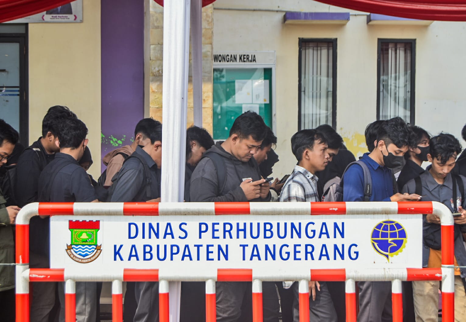 Sejumlah pencari kerja antre untuk mencari informasi lowongan kerja dalam bursa lowongan kerja Naker Fast Kabupaten Tangerang 2025 di Kantor Dinas Tanaga Kerja, Kabupaten Tangerang, Banten, Kamis (08/05/2025). Badan Pusat Statistik (BPS) mencatat angka pengangguran di Indonesia Pada Februari 2025 mencapai 7,28 juta naik sekitar 83 ribu orang atau 1,11 persen dibandingkan Febuari 2024 yang sebanyak 7,20 juta orang. Foto : Ilham Herda Fauzi/LENSABANTEN