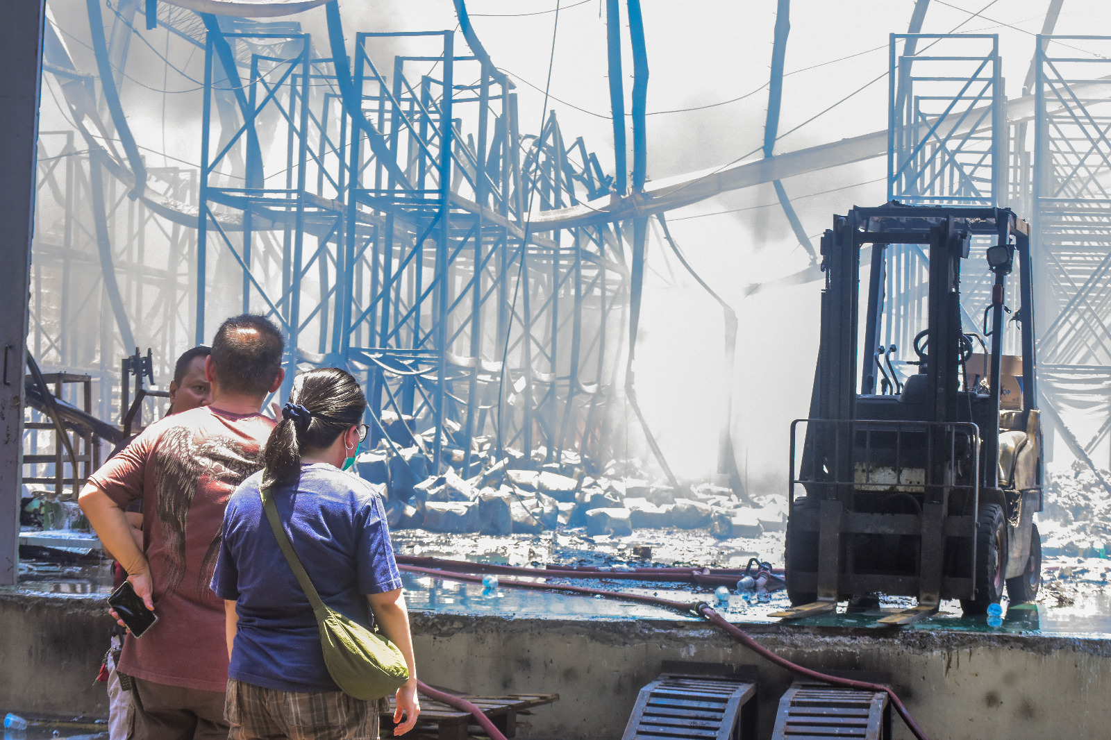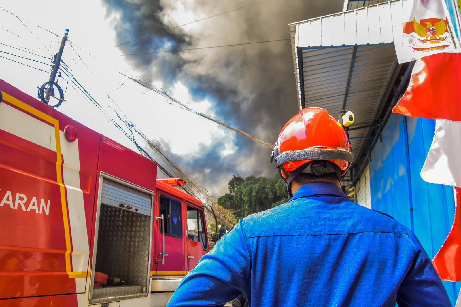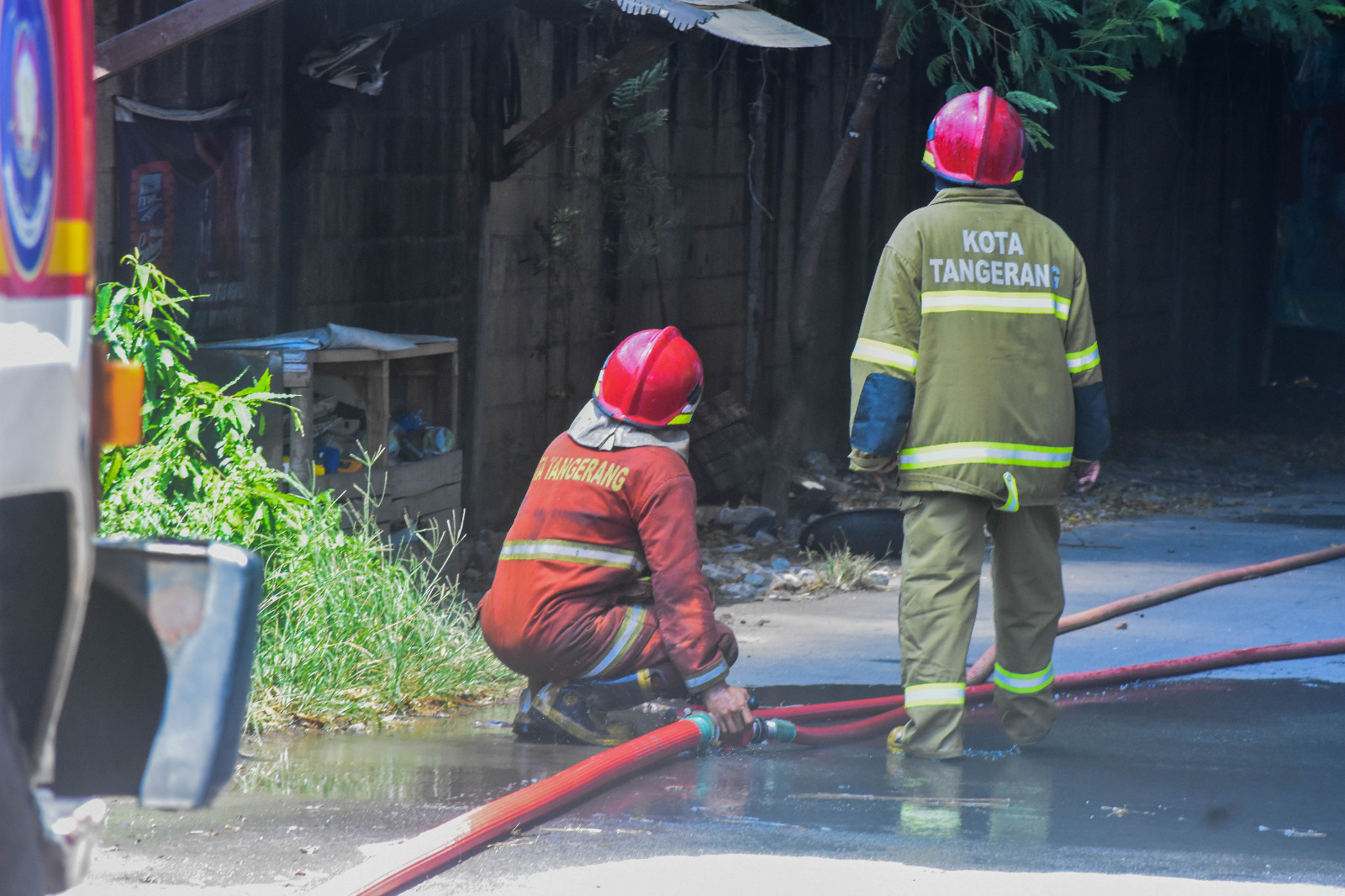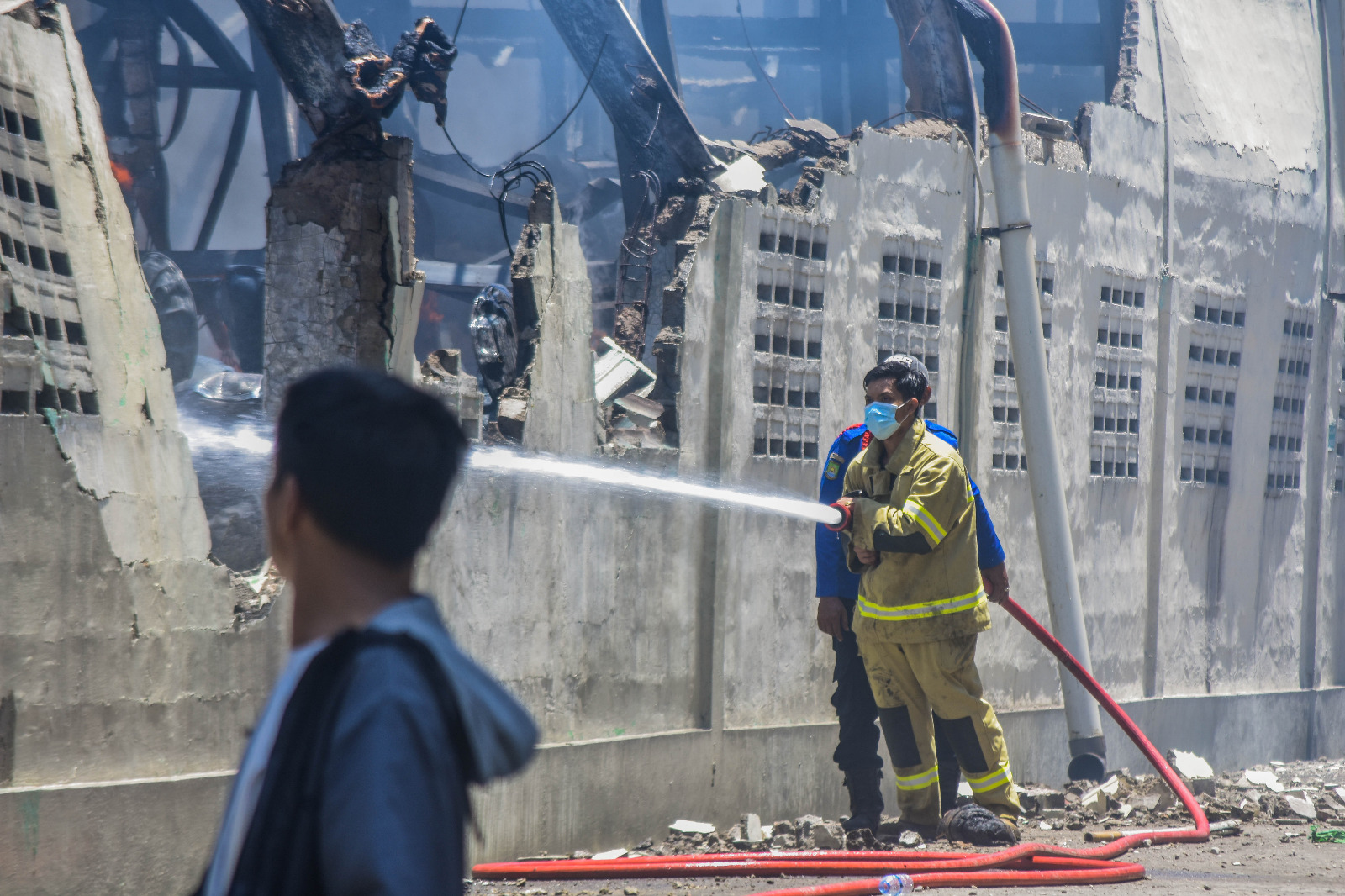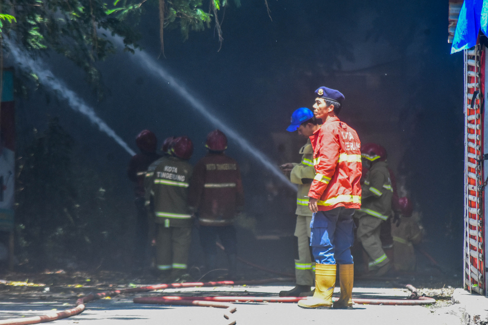 Petugas pemadam kebakaran melakukan pemadaman api saat kebakaran yang terjadi di PT Warnatama Cemerlang, Jalan . Industri VII kelurahan Pasir Jaya, Kecamatan Jatiuwung, kota Tangerang, Banten, Minggu (20/10/2024). Kebaran yang terjadi di pabarik yang memproduksi cat ini terjadi pukul 09:00 WIB. 15 unit mobil di kerahkan dari kota Tangerang dan 3 unit Mobil dari Kabupaten Tangerang dengan 100 personil dikerahkan, tidak ada korban jiwa dalam peristiwa ini. Foto : Ilham Herda Fauzi/LENSABANTEN