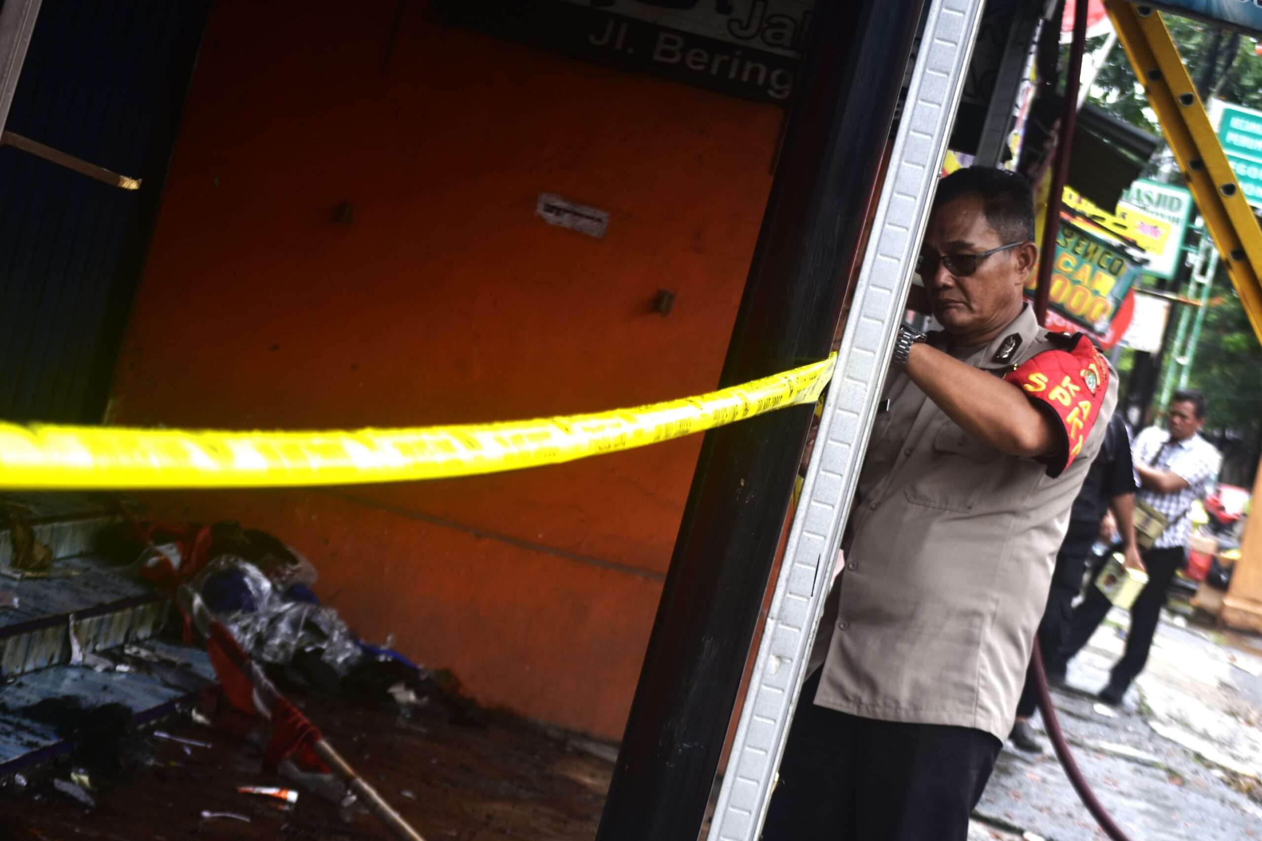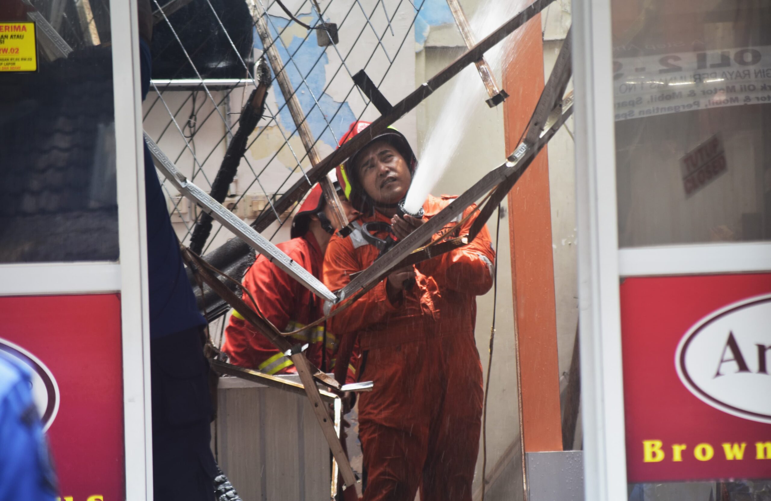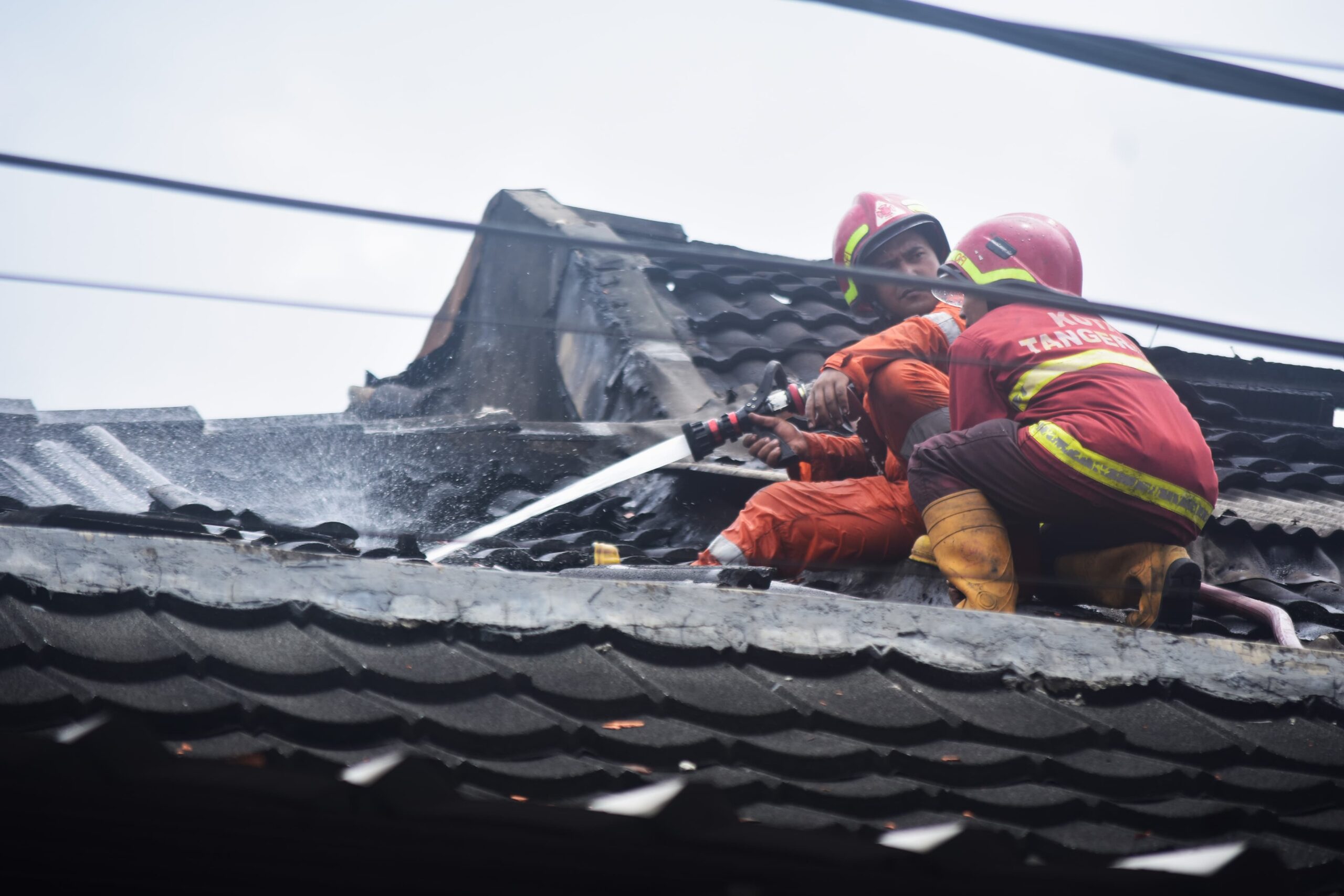 Sejumlah anggota Pemadam kebakaran melakukan pendinginan saat kebakaran di Jln. Beringin Raya, Perumnas 1, Kecamatan Karawaci, Kota Tangerang, Banten, Rabu (19/02/2025). Sebanyak empat kios terbakar dan 4 kios terdampak serta 2 bangunan warga terbakar diakibatkan kebocoran gas dari salah satu kios makanan. Dalam kejadian ini 2 orang mengalami luka bakar dan mengalami kerugian. Foto : Ilham Herda Fauzi/LENSABANTEN