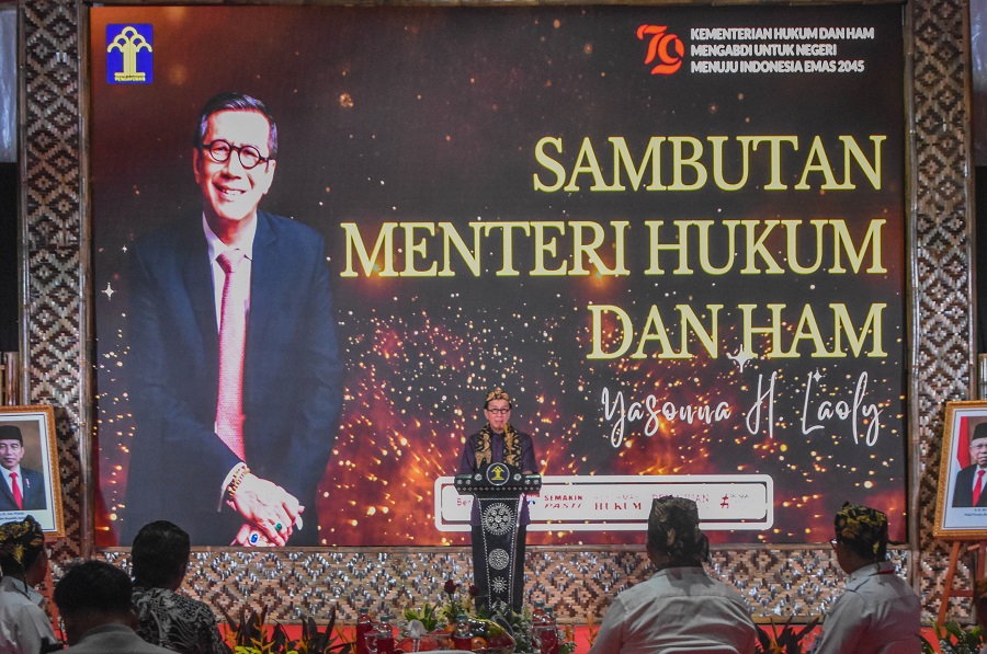 Menteri Hukum dan Hak Asasi Manusia Yasonna Laoly memberikan Piagam Penghargaan Anubhawa Sasana Desa/Kelurahan kepada kepala Daerah di lapangan Lembaga Pembinaan Khusus Anak (LPKA) Kelas 1, Kota Tangerang, Banten, Rabu (07/08/2024). Dalam acara Festival Layanan Hukum dan HAM provinsi Banten yang di hadiri oleh Menteri Hukum dan HAM Yasonna Laoly serta Pj Gubernur Al Muktakbar dan Bupati/Wali Kota se-Provinsi Banten, serta peresmian 51 Desa/Kelurahan Sadar Hukum dan pengukuhan 80 Desa/Kelurahan Binaan Sadar Hukum se-Provinsi Banten. Foto : Ilham Herda Fauzi/LENSABANTEN