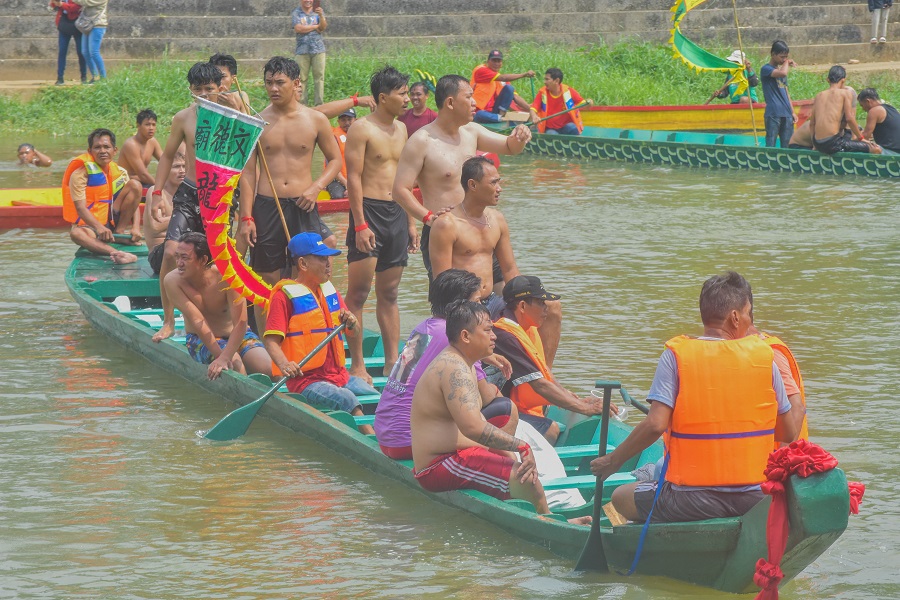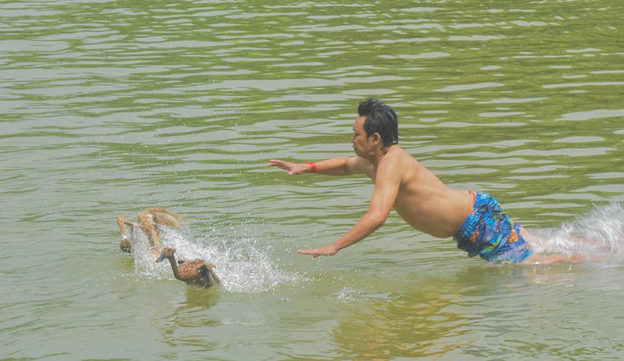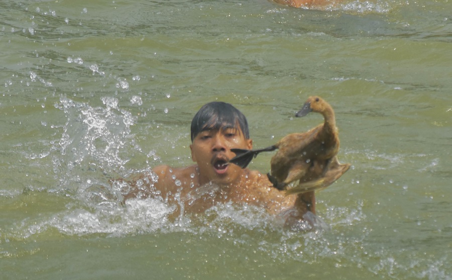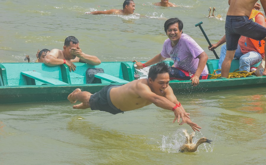 Warga mengikuti perlombaan tangkap bebek di Kali Cisadane Kota Tangerang, Banten, Senin (10/06/2024). Tradisi lomba tangkap bebek merupakan rangkaian perayaan Peh Cun yang dirayakan pada tanggal 5, bulan 5 dalam penanggalan china sebagai rasa menghormati meninggalnya seorang pejabat pada zaman Dinasti Chu (340 SM) yang sangat dicintai rakyat bernama Qu Yuan. Foto : Ilham Herda Fauzi/LENSABANTEN