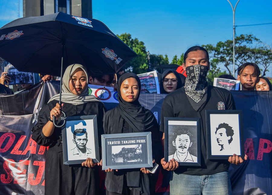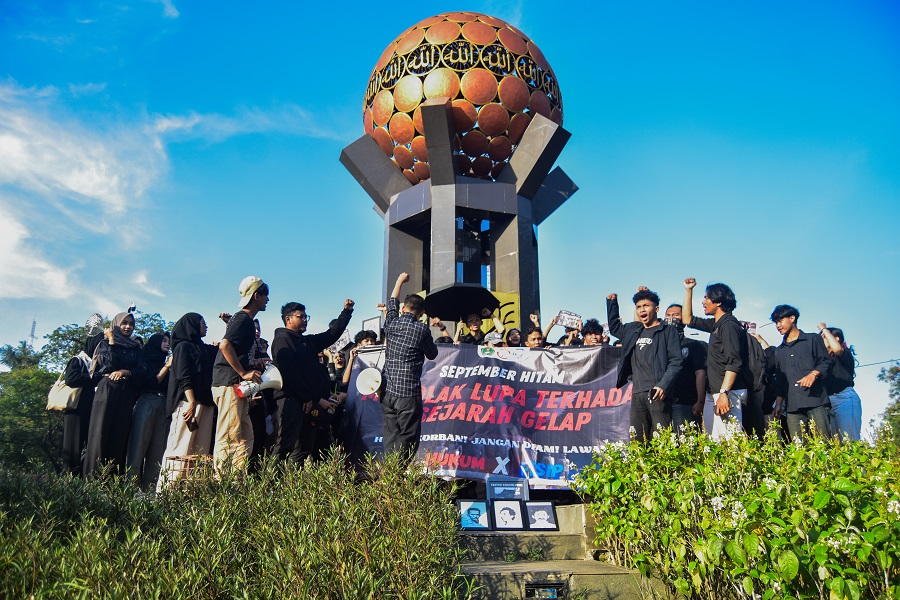 Sejumlah mahasiswa menggelar aksi menolak lupa September hitam di tugu Adipura Kota Tangerang, Banten, Senin (30/09/2024).