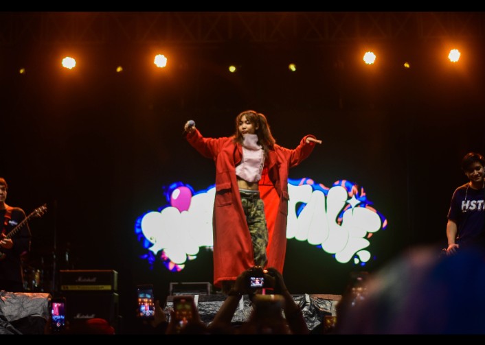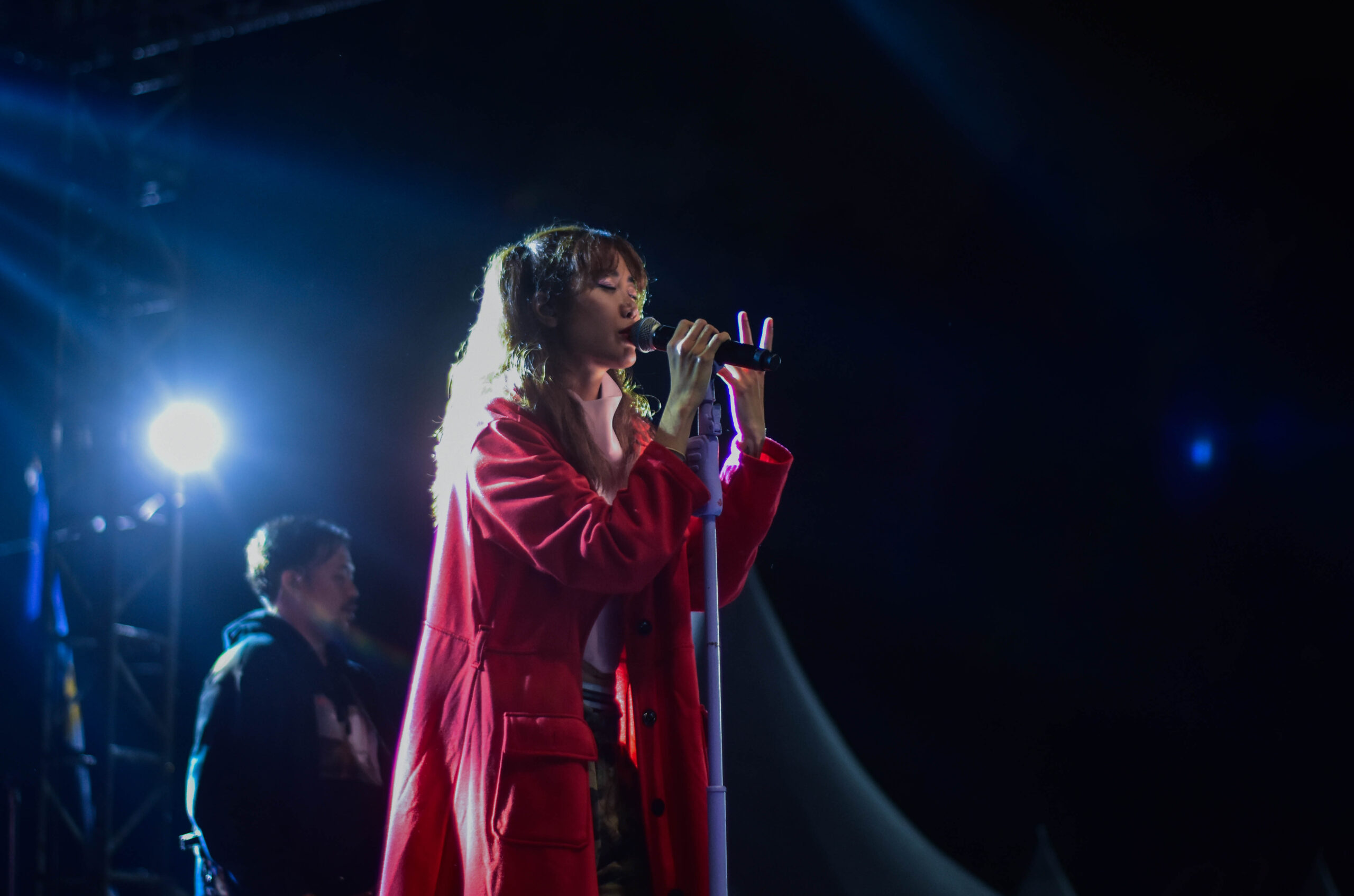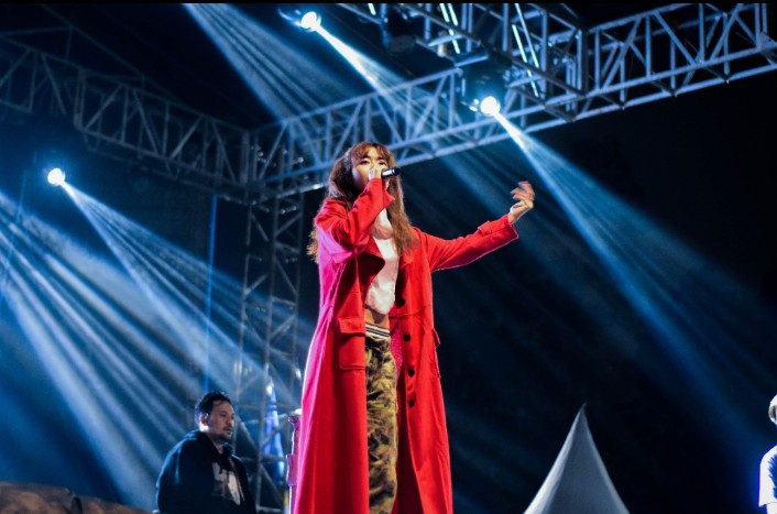 Widy Soediro Nichlany vokalis band Vierratale membawakan lagu nya saat tampil di Culinary Day, Alun-alun Ahmad Yani, Kota Tangerang, Banten, Minggu (15/12/2024) Malam. Pemerintah Kota Tangerang melalui DinasĀ kebudayaan dan pariwisata kota Tangerang menggelar Culinary Day yang di meriahkan oleh grup musik pop rock asal Jakarta, Band Vierratale yang menghibur masyarakat Tangerang. Foto : Ilham Her da Fauzi/LENSABANTEN