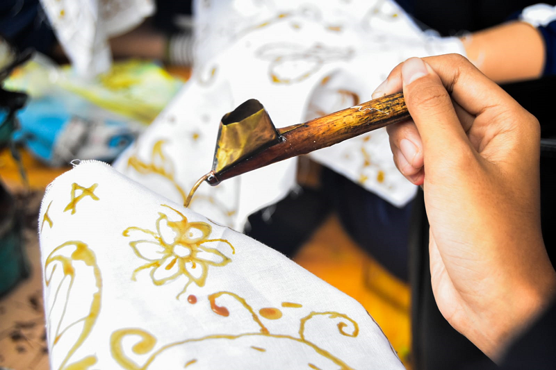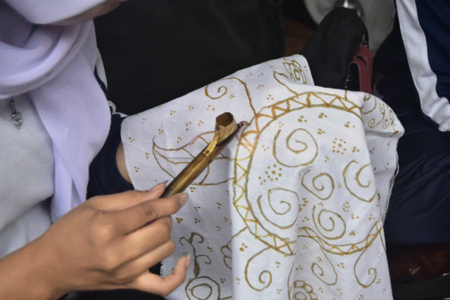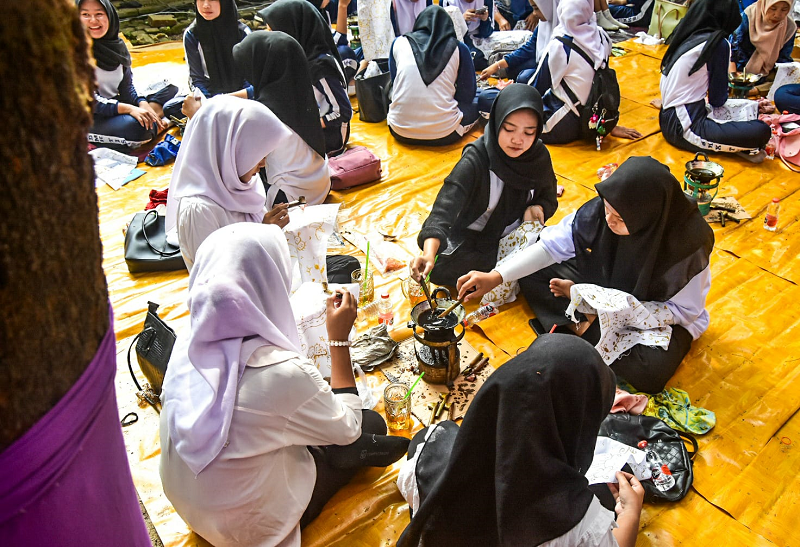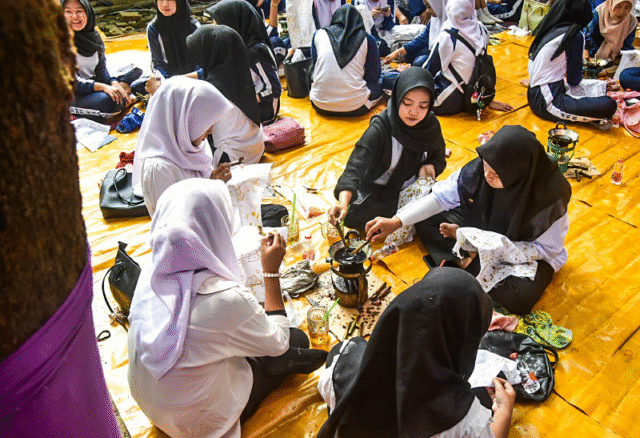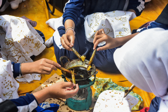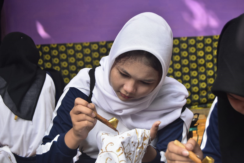 Siswa belajar membatik saat Festival Batik Tangerang di Desa Kemuning, Kabupaten Tangerang, Banten, Rabu (16/07/2025). Festival Batik Tangerang yang menampilkan kegiatan pembuatan batik, lomba lukis batik, dan pameran seni kriya sebagai upaya memperkenalkan dan melestarikan batik sebagai warisan budaya Indonesia, festival tersebut berlangsung 16 – 18 Juli 2025. Foto : Ilham Herda Fauzi/LENSABANTEN