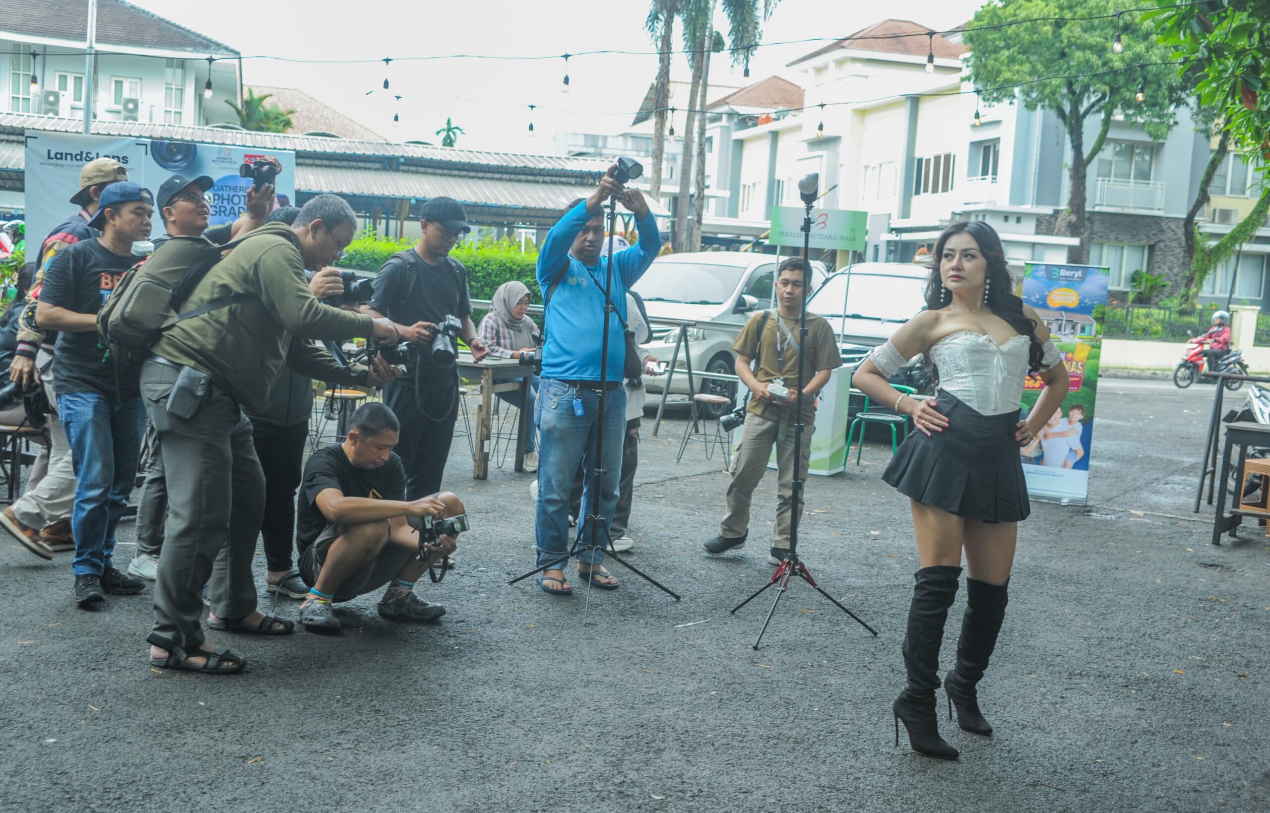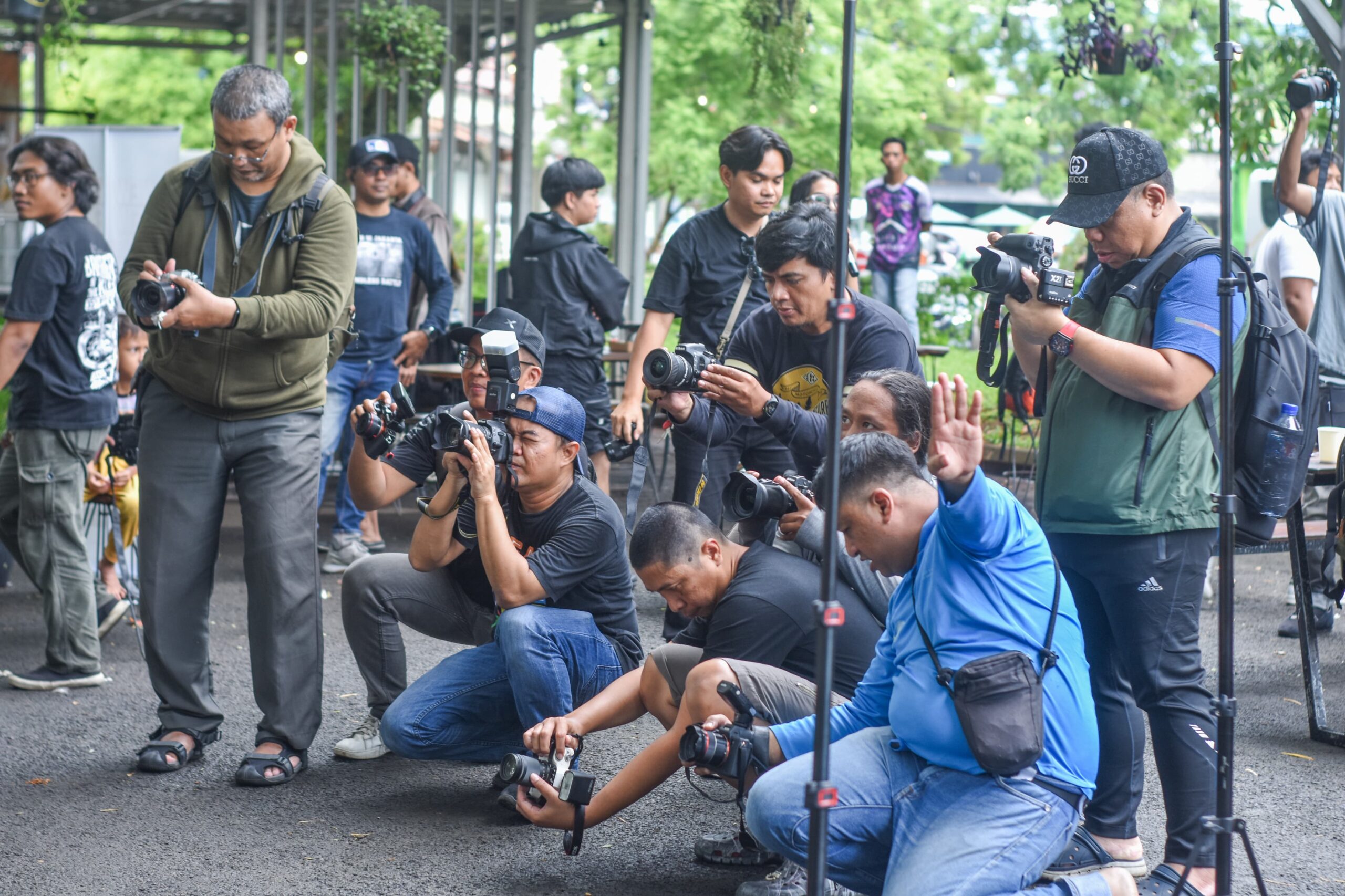 Sejumlah fotografer memotret model saat gathering photography competition di Kafe Om Blek BSD, Kota Tangerang Selatan, Banten, Sabtu (22/02/2025). Acara ini digelar