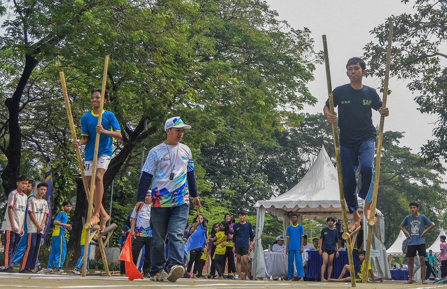 Peserta egrang sedang beradu cepat di Stadion Benteng Reborn, Kota Tangerang, Banten, Kamis (18/07/2024). Pemerintahan Kota Tangerang melalui Dinas Pemuda dan Olahraga (Dispora) mengadakan Pekan Olahraga Tradisional Kota (Portadkot) ke II dengan mempertandingkan 5 jenis olahraga seperti egrang, gangsing, sumpit, hadang, teropang panjang. Kegiatan ini di ikuti 550 lebih peserta dari kalangan pelajar, santri, mahasiswa, dan club olahraga tradisional di Kota Tangerang.