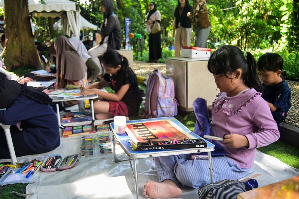 Peserta mengikuti lomba melukis pemandangan saat Festival Literasi Mookevart di kota Tangerang di Hutan Kota Tangerang, Banten, Sabtu (24/05/2025). Lomba yang diikuti 57 peserta dari tingkat SD hingga SMA ini merupakan bentuk apresiasi sekaligus apresiasi terhadap bakat para anak-anak pelajar. Foto : Ilham Herda Fauzi/LENSABANTEN