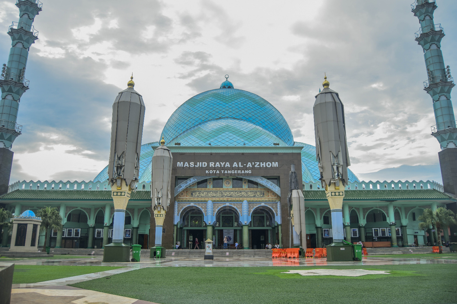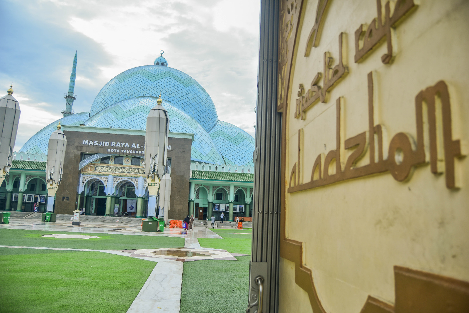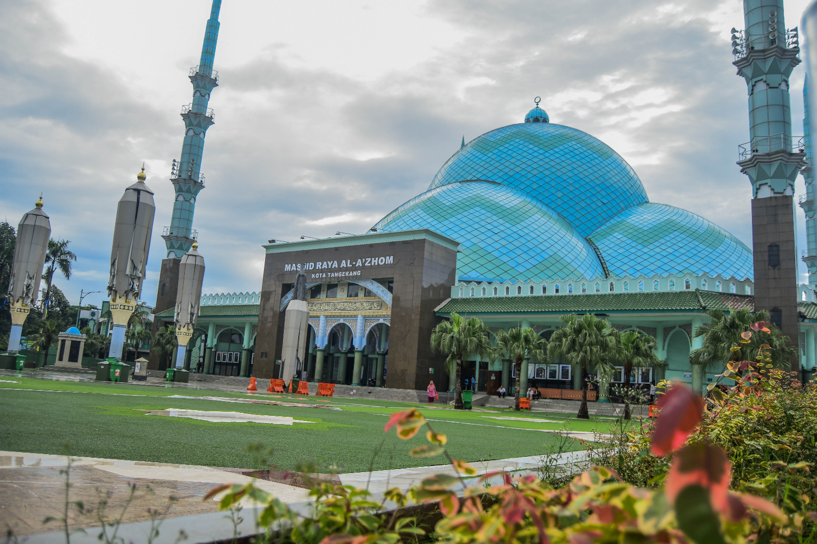 Masjid Raya Al-Azhom merupakan masjid dengan kubah terbesar tanpa tiang penyangga, karena desainnya yang unik dengan memiliki 5 kubah besar menjadi ciri khasnya. kemegahan dan keunikannya menjadikan masjid ini destinasi wisata religi diKota Tangerang. Foto : Ilham Herda Fauzi/LENSABANTEN