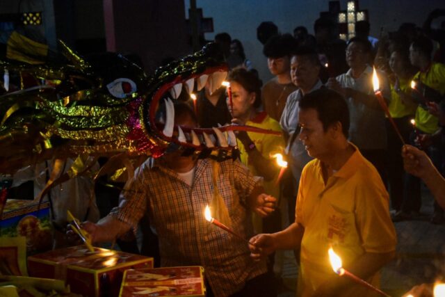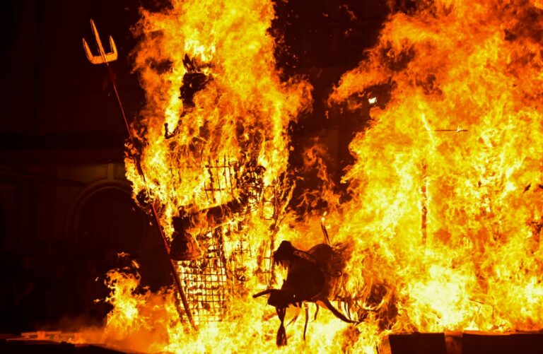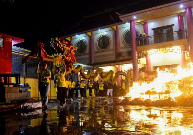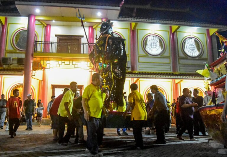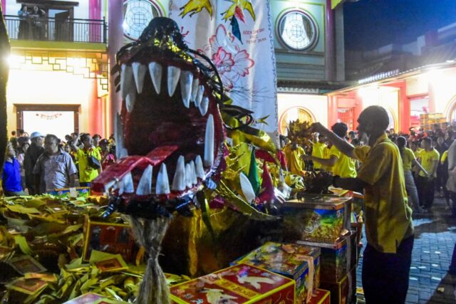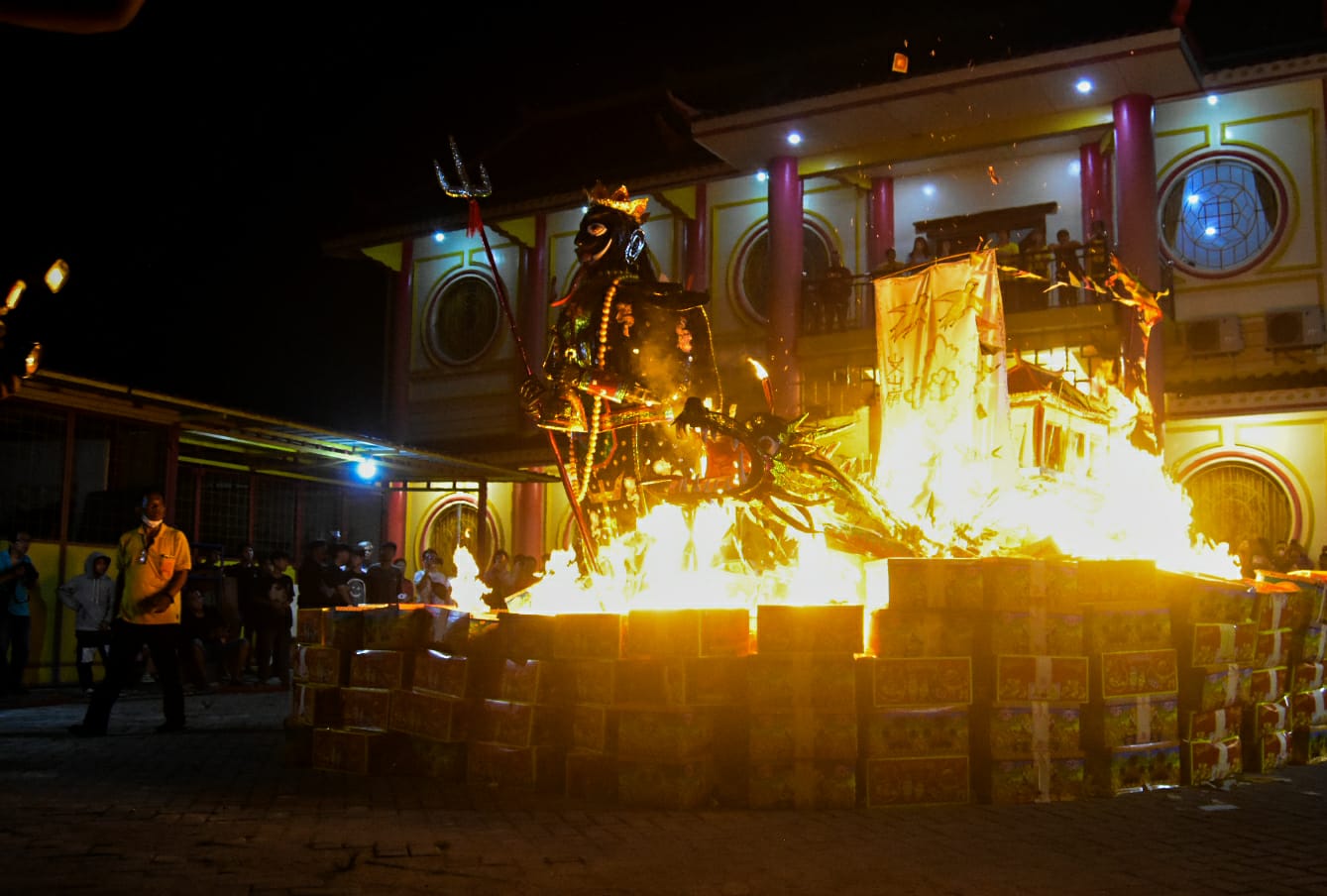 Warga keturunan Tionghoa membakar replika raja setan dan perahu naga dalam tradisi ritual Cioko di Vihara Boen San Bio, Karawaci, Kota Tangerang, Banten, Rabu (17/09/2025). Ritual mengirim doa kepada arwah-arwah leluhur tersebut dilakukan dengan cara membakar replika perahu naga dan boneka raksasa raja setan. Foto : Ilham Herda Fauzi/LENSABANTEN