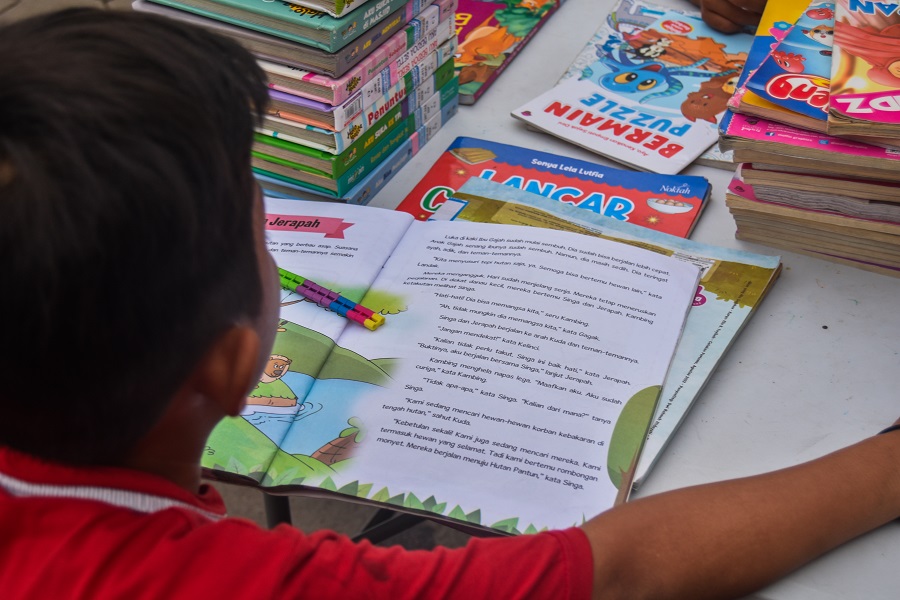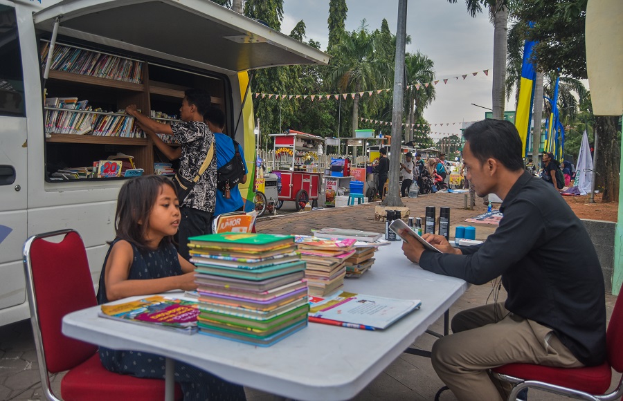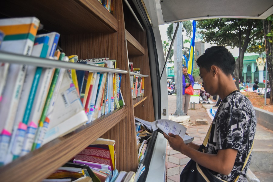 Warga membaca buku di waktu menunggu buka puasa di Taman Elektrik, Jalan Satria – Sudirman, Pusat Pemerintahan Kota Tangerang, Banten, Kamis (28/03/2024). Dinas Perpustakaan dan Arsipan Daerah (DPAD) Kota Tangerang menyebar mobil perpustakaan keliling di lokasi Taman Gajah dan Taman Elektrik. Program ini dinamai NGABUBUREAD nunggu buka puasa sambil baca guna terus meningkatkan budaya membaca kepada masyarakat Kota Tangerang. Foto : Ilham Hedra Fauzi/LENSABANTEN