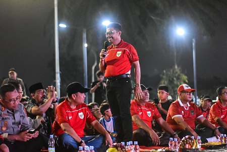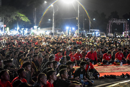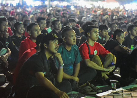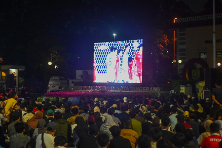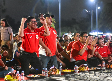Warga menyaksikan pertandingan final Piala AFF U-23 2025 antara Timnas Indonesia melawan Vietnam di Taman Elektrik, Kota Tangerang, Banten, Selasa (29/07/2025). Pemerintah Kota Tangerang menggelar Nonton bareng sebagai bentuk dukungan kepada Timnas Indonesia U-23 yang dihadiri Ribuan warga Walaupun dalam pertandingan tersebut kalah dari Vietnam dengan skor akhir 1-0. Foto : Ilham Herda Fauzi/LENSABANTEN