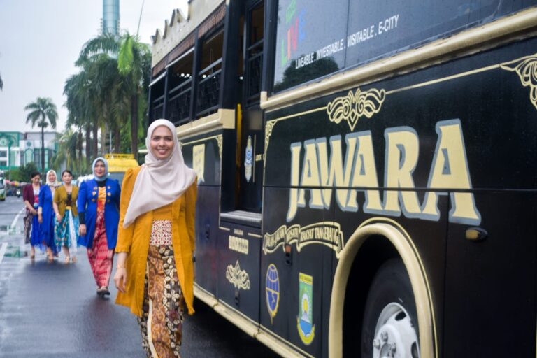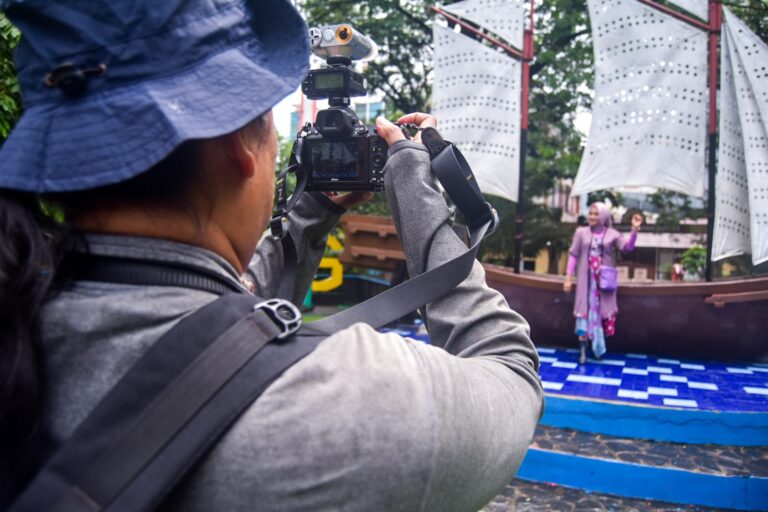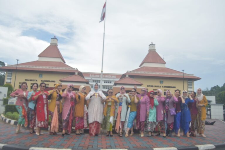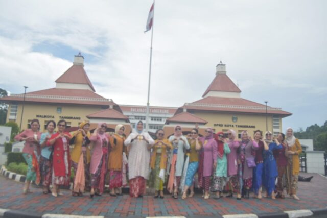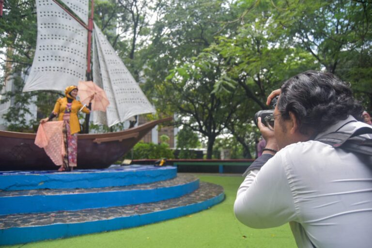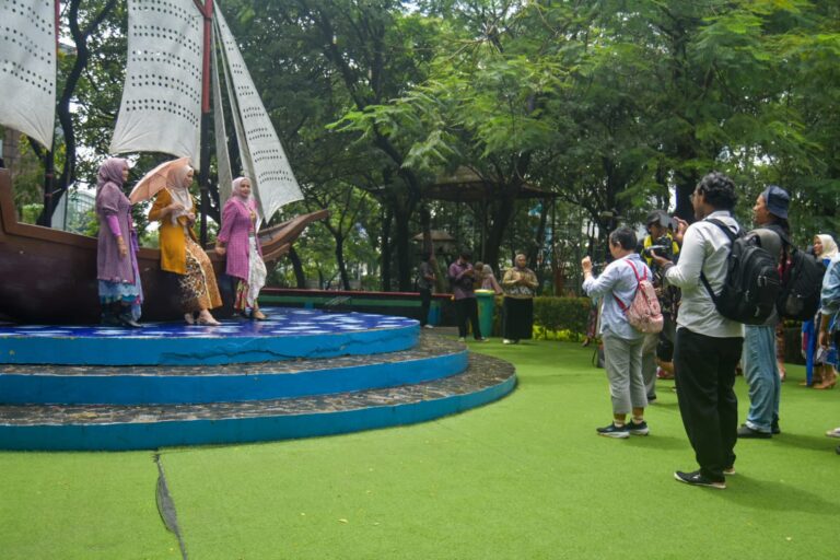 Pegiat fotografi memotret model saat parade Hari Batik Nasional di Taman Potret, Kota Tangerang, Banten, Kamis (02/10/2025). komunitas Taman Potret (Kotret) berkolaborasi bersama Perempuan Berkebaya Indonesia (PBI) Tangerang Raya menggelar hunting foto parade batik di Bus Jawara dalam memperingati Hari Batik Nasional serta mengasah kreatifitas dan kemampuan pegiat fotografi. Foto : Ilham Herdy Fauzi/LENSABANTEN
