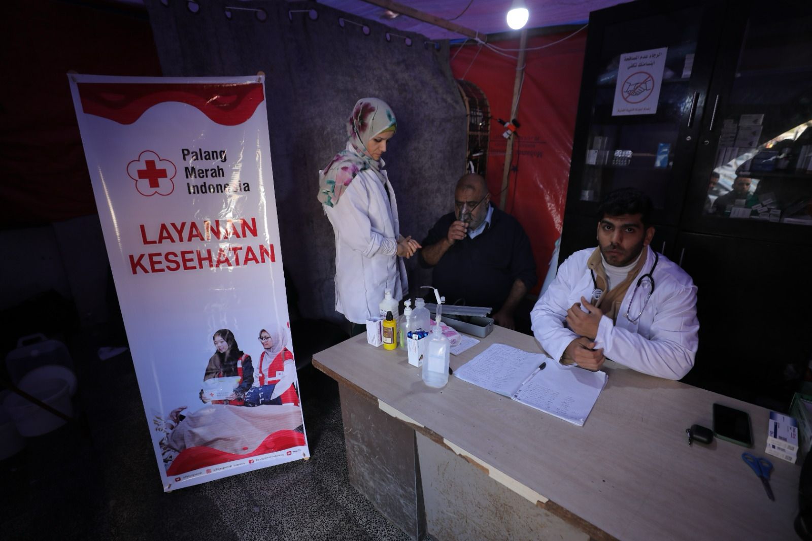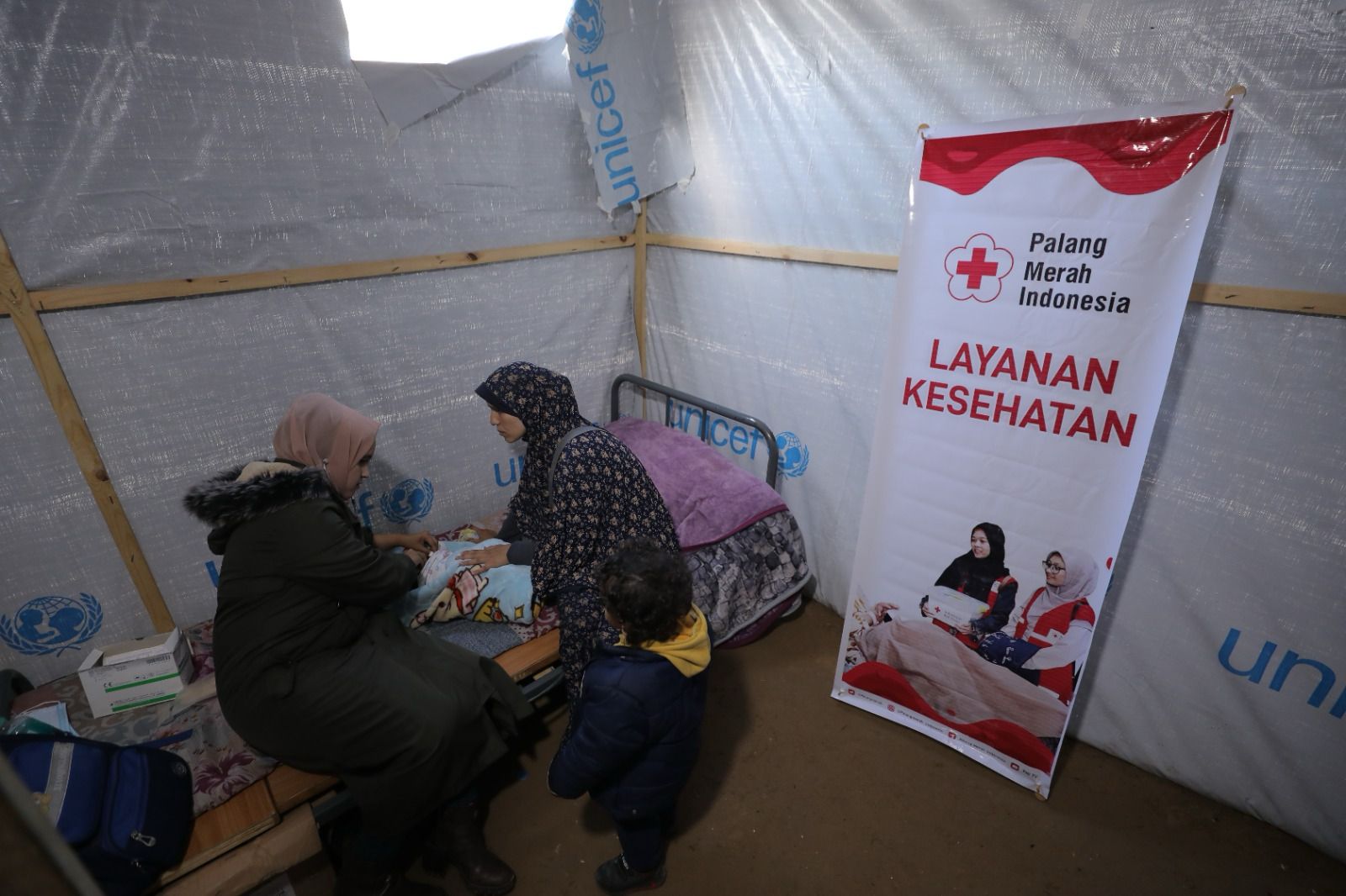 Palang Merah Indonesia (PMI) bekerjasama dengan Lembaga Bantuan Medis di Gaza melakukan layanan kesehatan keliling maupun door to door dari tenda ke tenda. Hal ini untuk membantu pengungsi warga di jalur Gaza, Palestina yang dalam kondisi sakit untuk mendapatkan akses dan penanganan medis. Foto : HO/PMI