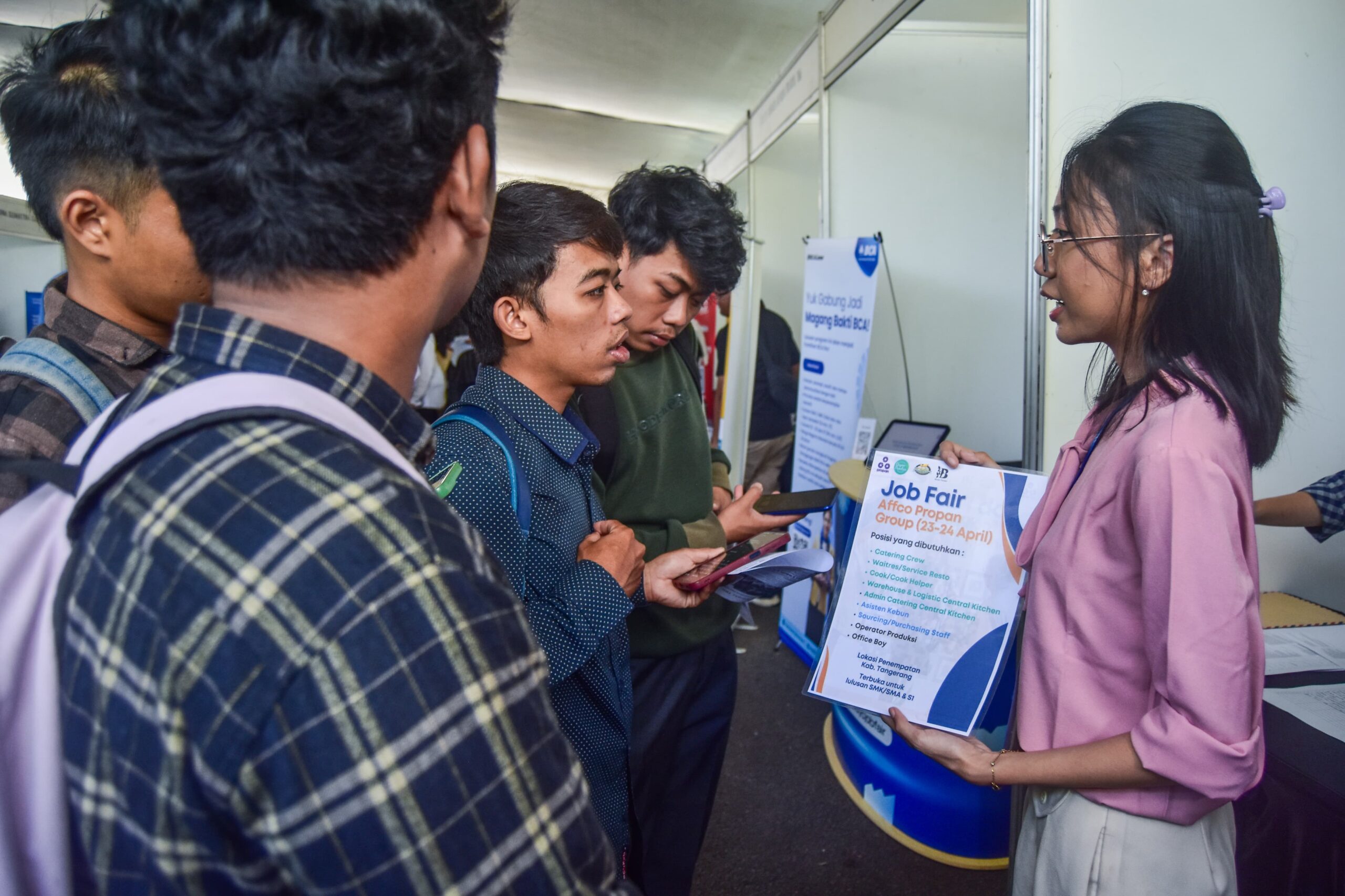 Sejumlah pencari kerja antre untuk mengikuti pameran bursa kerja di Mall TangCity, Kota Tangerang, Banten, Rabu (23/04/2025).