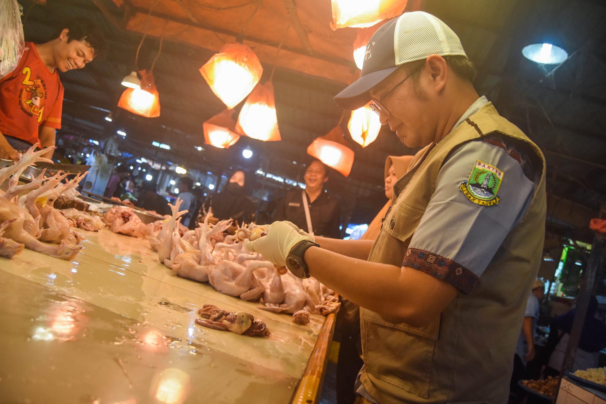Sejumlah petugas Dinas Pertanian dan Ketahanan Pangan Provinsi Banten mengecek daging ayam di Pasar Cikupa, Kabupaten Tangerang, Banten, Kamis (06/03/2025). Dinas Pertanian dan Ketahanan Pangan kabupaten Tangerang bersama Dinas Pertanian Provinsi Banten melakukan pengawasan produk hewan menjelang Hari Besar Keagamaan dan Nasional (HBKN) 2025. Dalam pengawasan tersebut bertujuan produk hewan yang berada di pedagang adalah produk sehat, utuh, dan halal agar masyarakat dapat mengkonsumsi produk hewan dengan rasa aman, nyaman dan menyehatkan. Foto : Ilham Herda Fauzi/LENSABANTEN