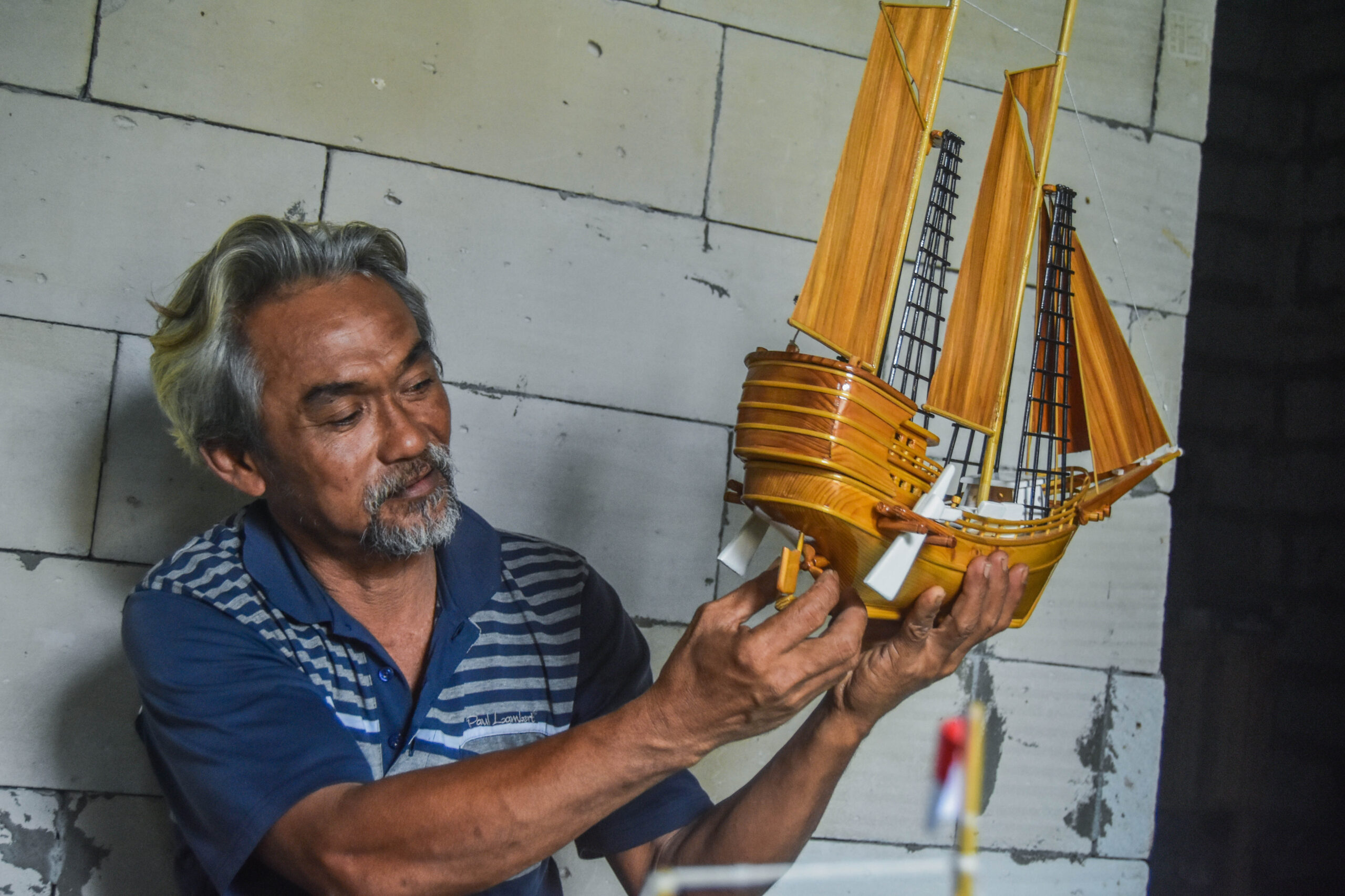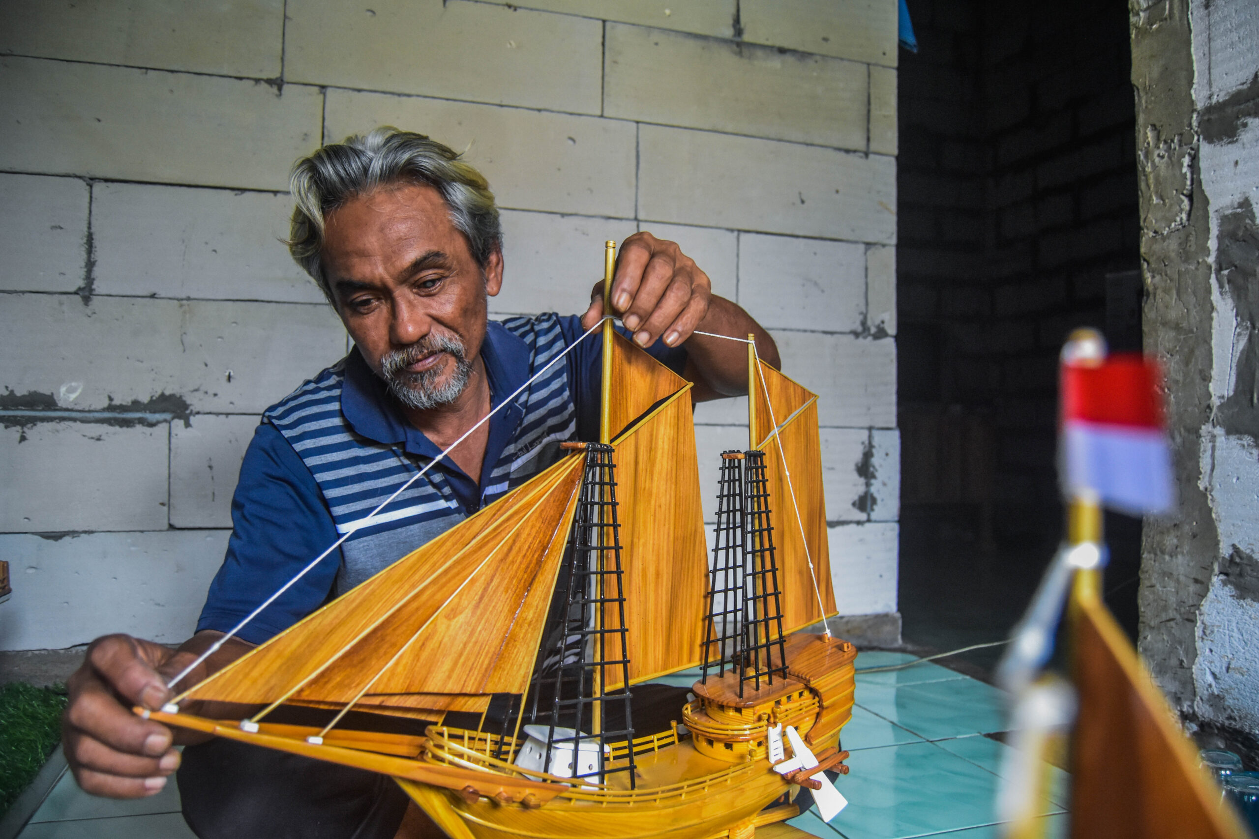 Pak Jeni memanfaatkan limbah kayu palet menjadi sebuah kerajinan yang menarik seperti Miniatur kapal, Miniatur masjid, dan Miniatur motor. Kerajinan yang di buatnya di bandrol dari Rp. 700.000 hingga Rp. 1.000.000 tergantung ukuran miniatur. Foto : Ilham Herda Fauzi/LENSABANTEN