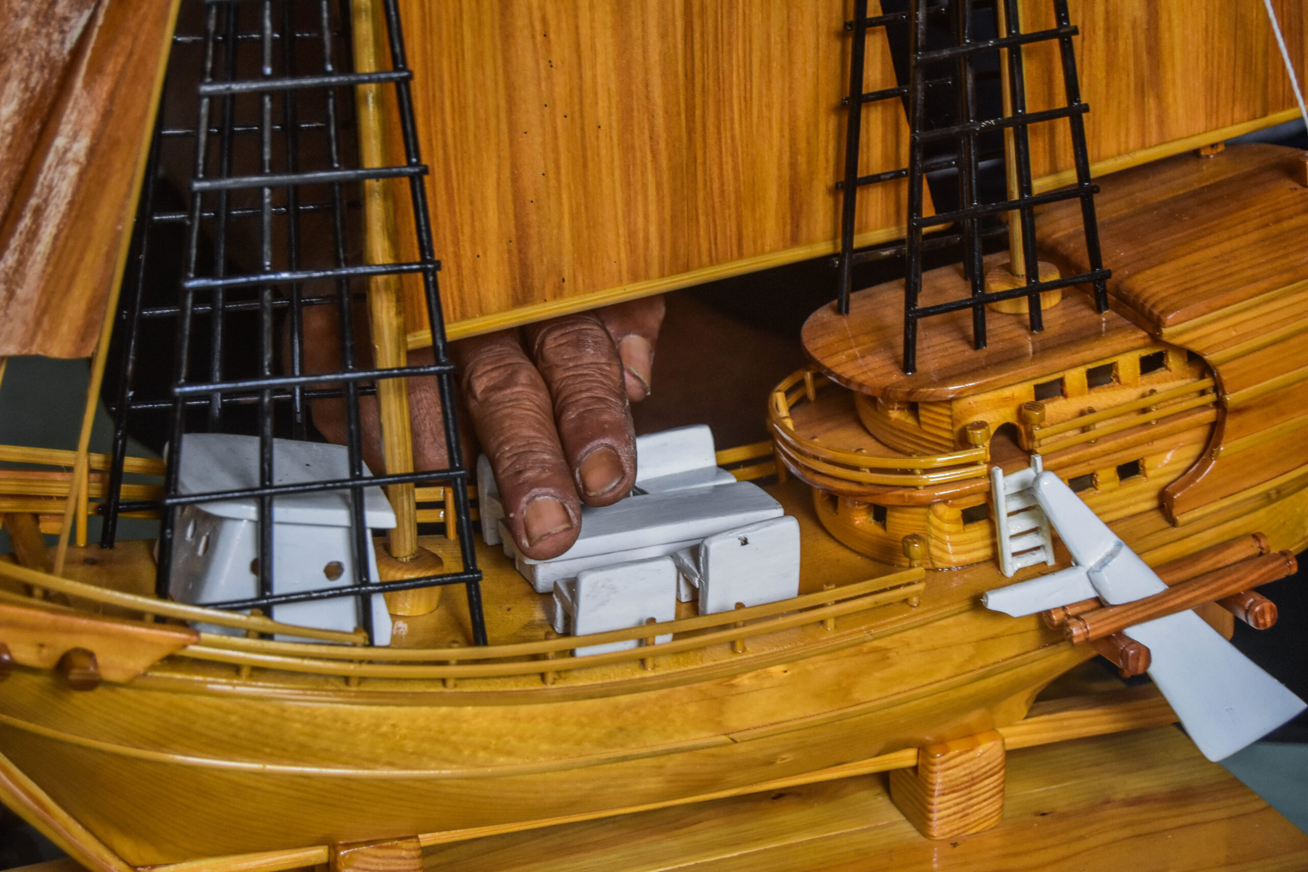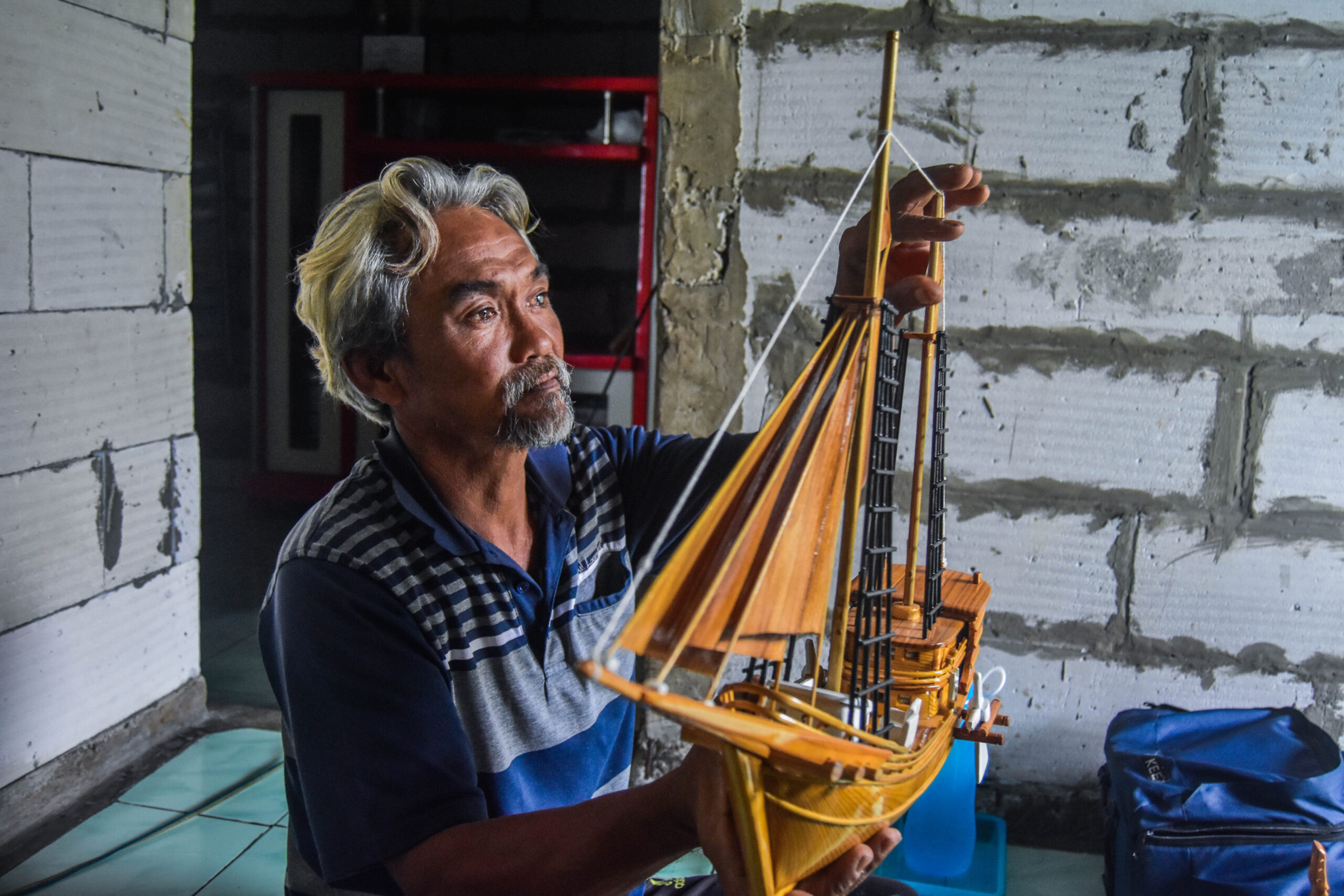 Seorang warga kampung Ketapang pak Jeni mengukir pembuatan miniatur kapal di rumah miliknya Gang Sawo, RT 12 RW 05, Desa Ketapang, Kecamatan Mauk, Kabupaten Tangerang, Banten, Rabu, (04/12/2024).