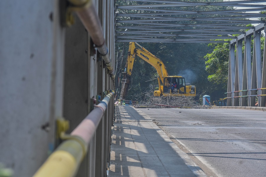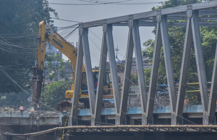 Pekerja menjalankan alat berat yang sedang menghancurkan di jembatan Pintu Air 10, Kecamatan Karawaci, Kota Tangerang, Banten, Kamis (06/06/2024). Jembatan Pintu Air 10 Kota Tangerang sedang dilakukan revitalisasi mulai 5 juni hingga akhir juli 2024, sementara arus lalu lintas jalan tersebut di alihkan seperti jalan dari arah Sangego yang akan menuju ke arah Bandara Internasional Soekarno-Hatta dapat menggunakan Jalan K.S Tubun-Jalan Daan Mogot-Pintu Air (Mookervart)-Jalan dr. Sitanala-Jalan Marsekal Suryadarma (Simpang Tujuh). Foto : Ilham Herda Fauzi/LENSABANTEN