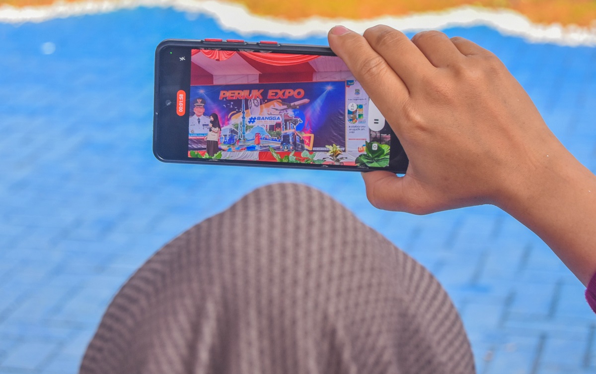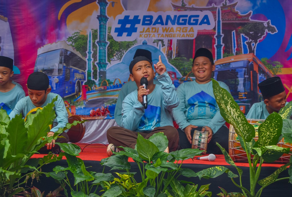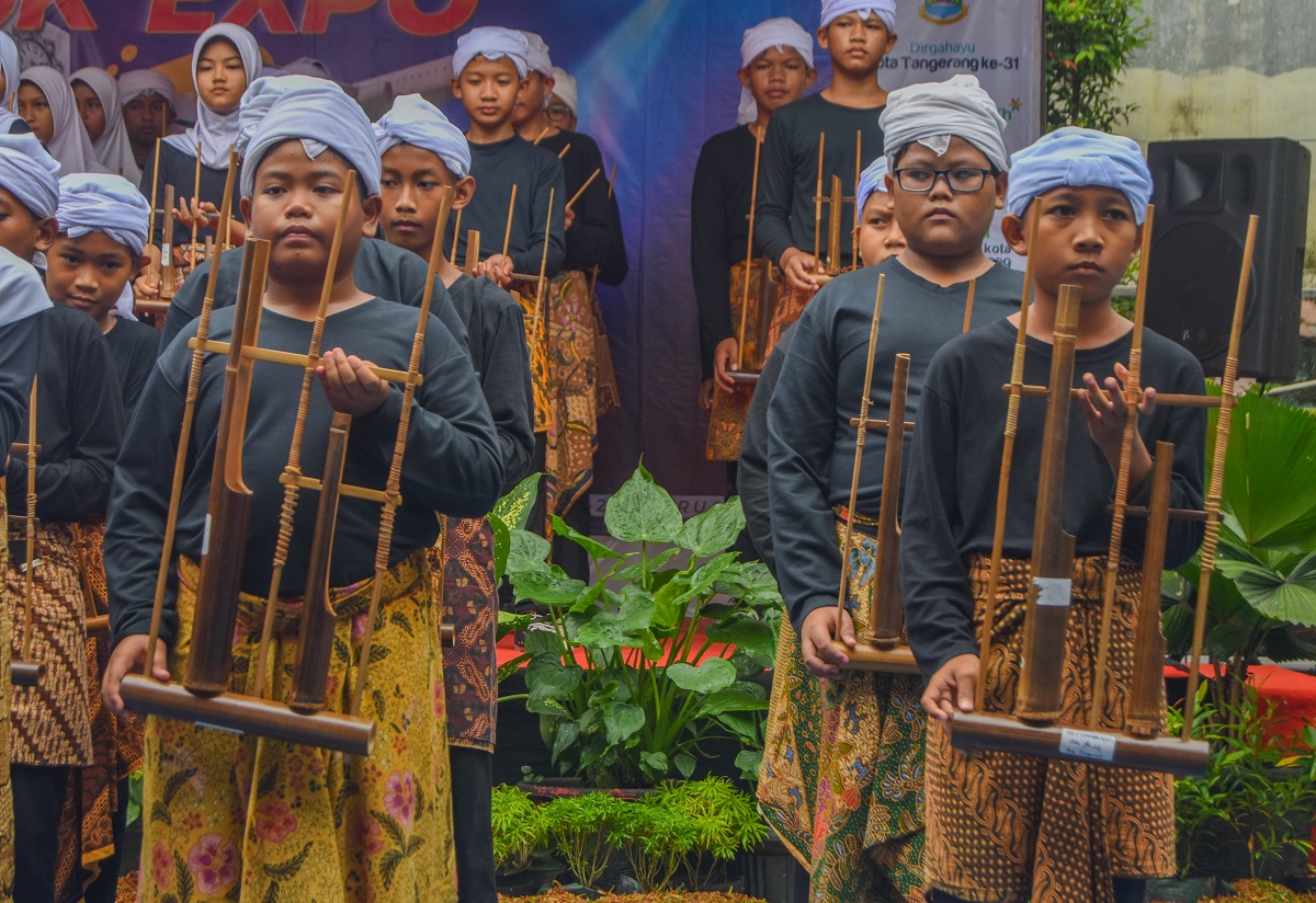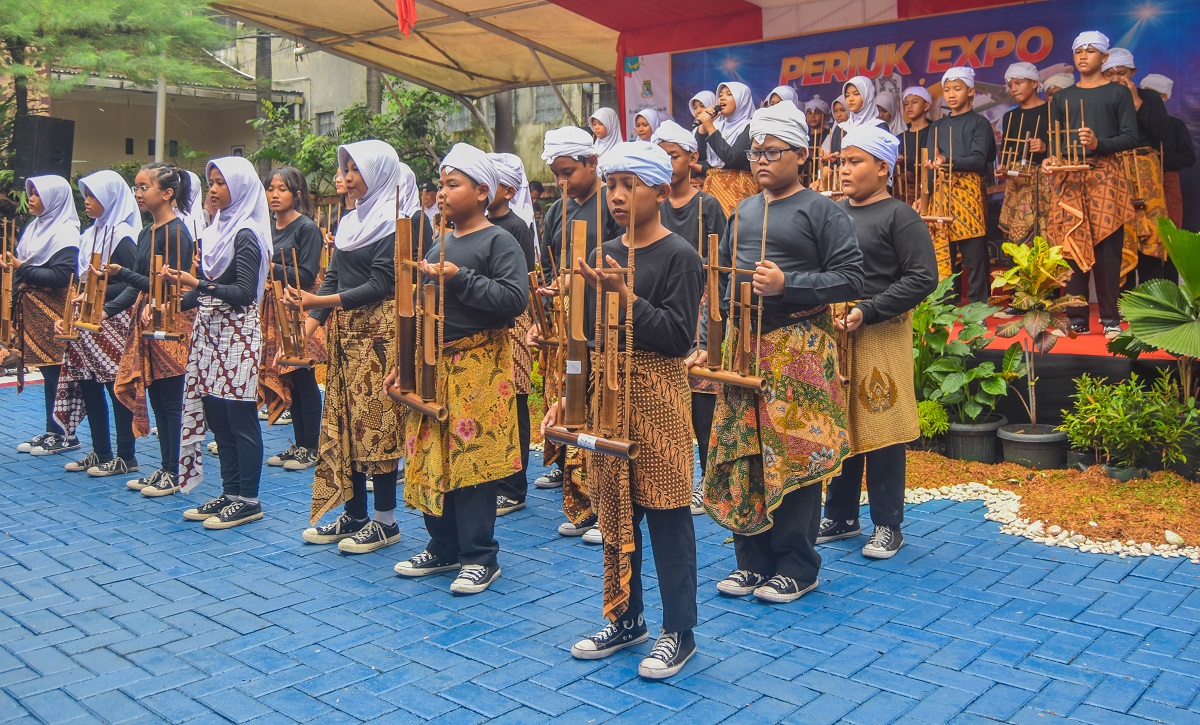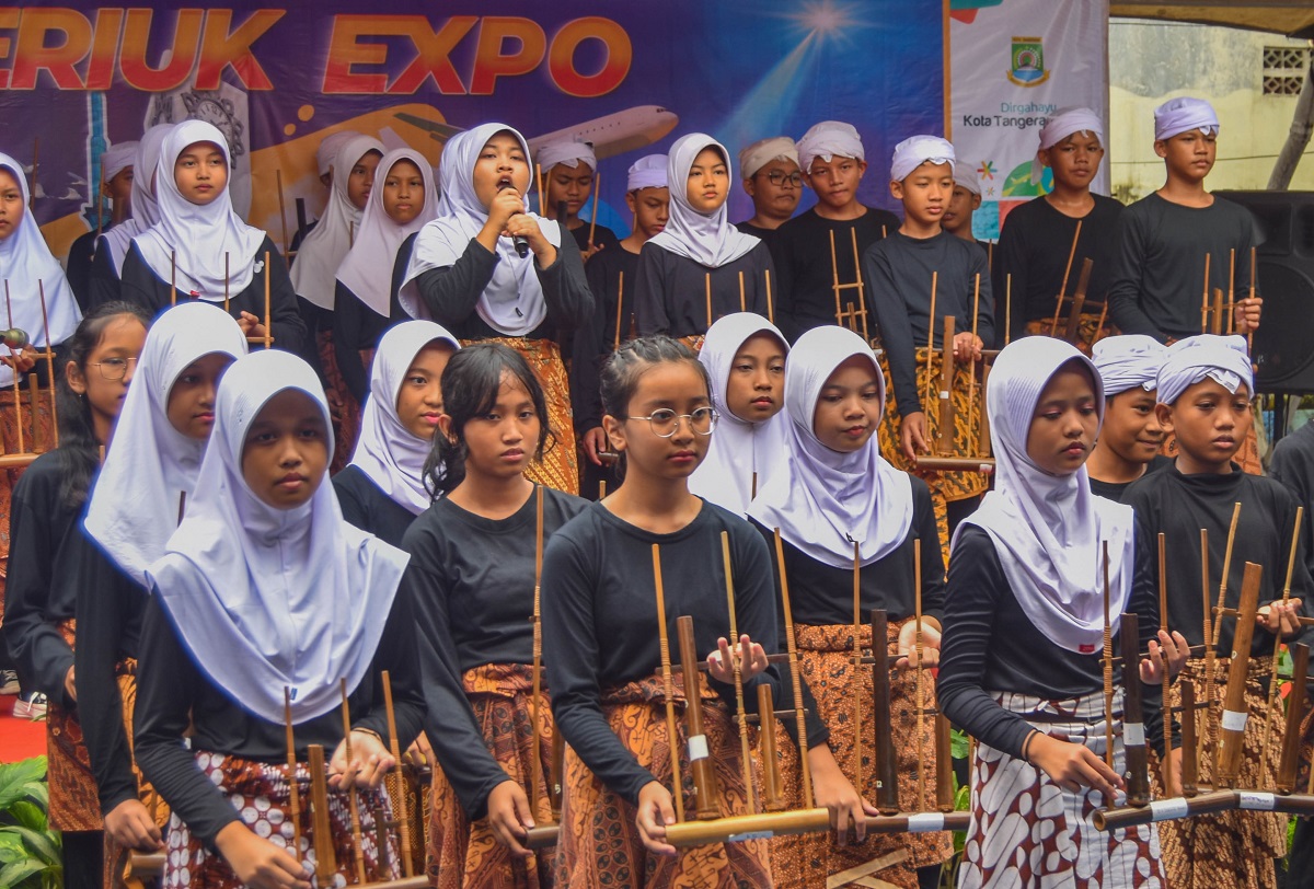 Sejumlah Murid SD Gebang Raya 1 tampil menyanyi yang di iringi alat musik Angklung dari Jawa Barat di Kantor Kecamatan Periuk, Kota Tangerang, Banten, Rabu (28/02/2024). Dalam acara Periuk Expo mengadakan penampilan kreasi dari tingkat TK, SD hingga SMP di wilayah Kecamatan Periuk, acara ini memperingati HUT Kota Tangerang yang ke 31 Tahun. Foto : Ilham Herda Fauzi/LENSABANTEN