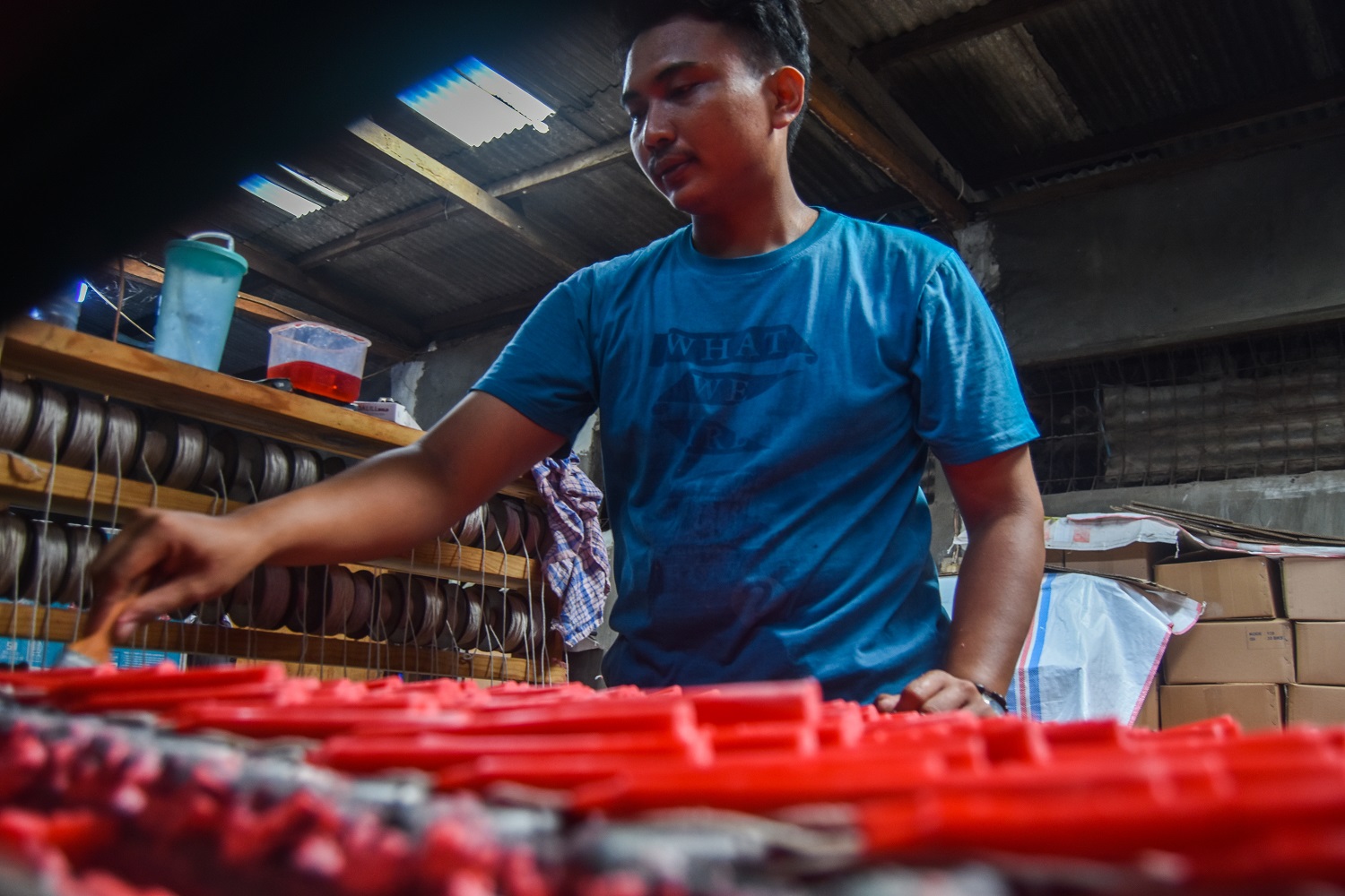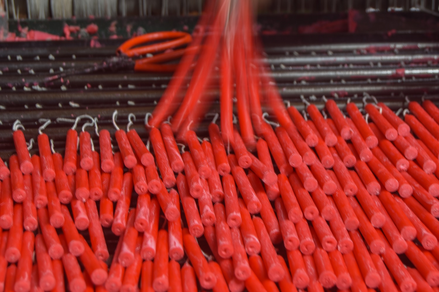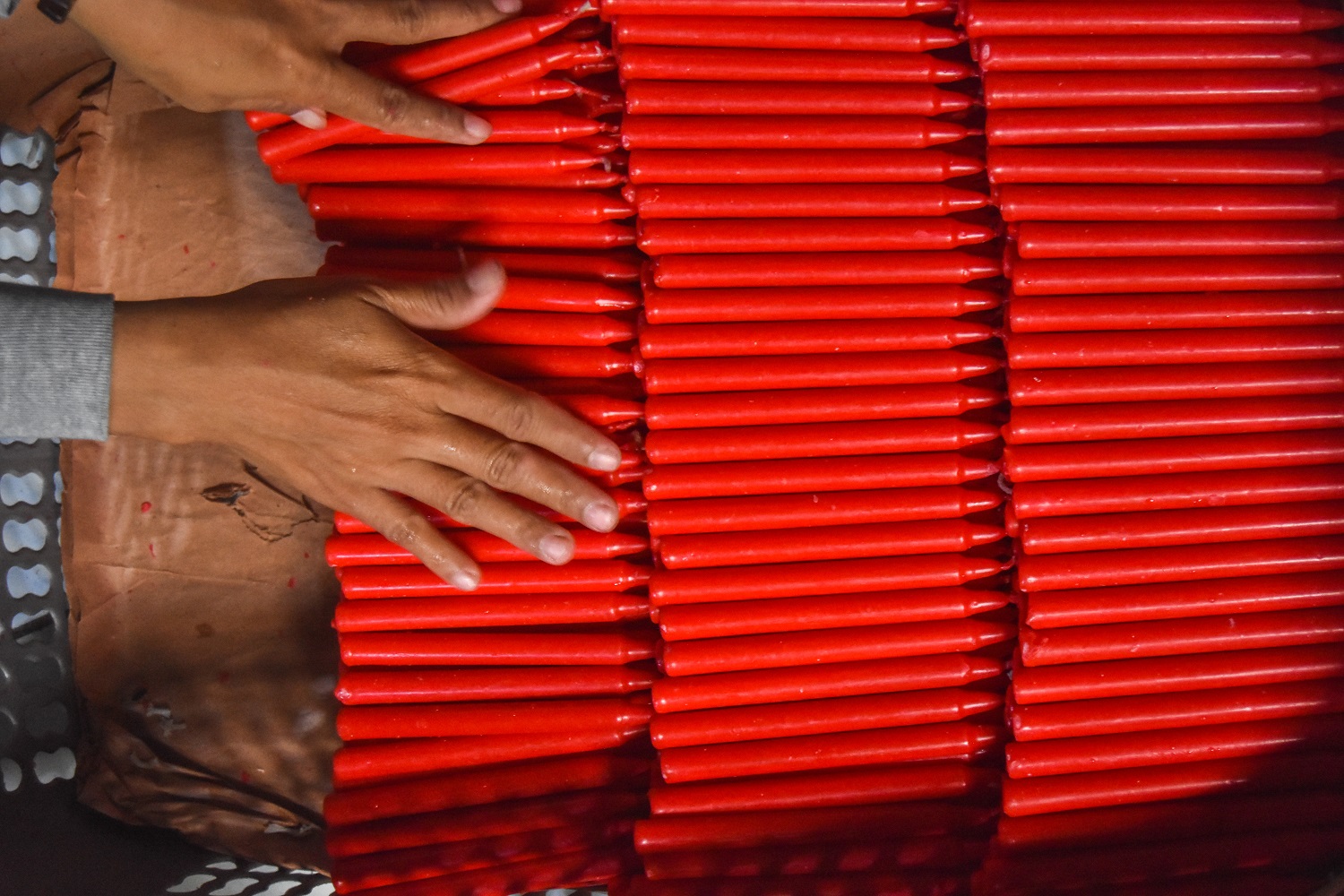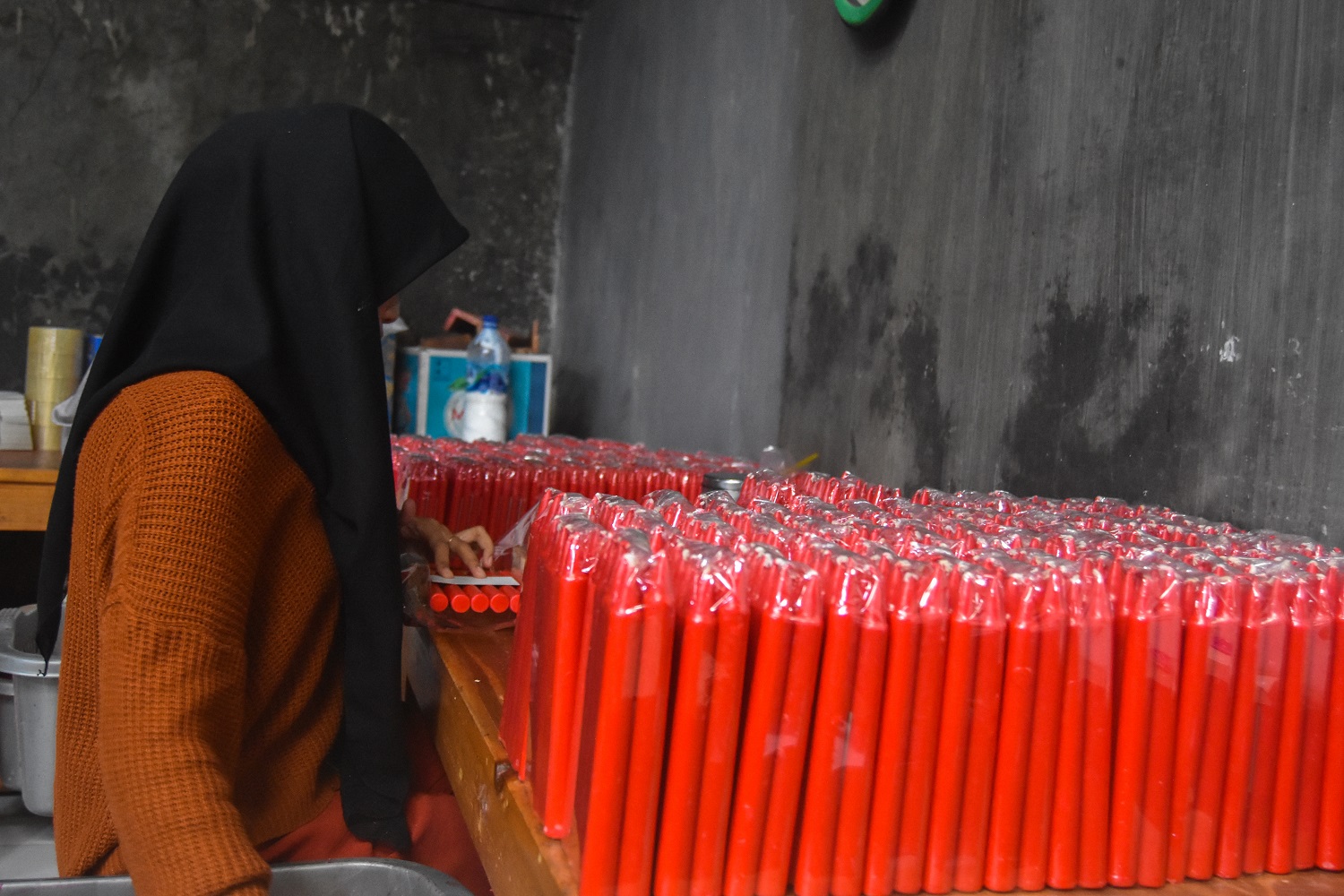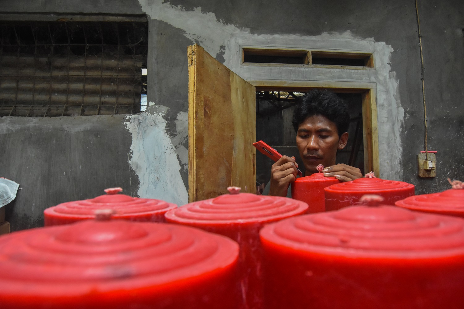 Pekerja sedang membuat sebuah Lilin merah untuk peribadahan di Kampung Melayu, Kecamatan. Teluknaga, Kabupaten Tangerang, Banten, Senin (29/01/2024). Industri rumahan ini menyediakan lilin dan kertas ibadah yan banjir orderan menjelang tahun baru imlek 2024, selain di distribusikan di Tangerang juga luar daerah. FOTO : Ilham Hendra Fauzi/LENSABANTEN