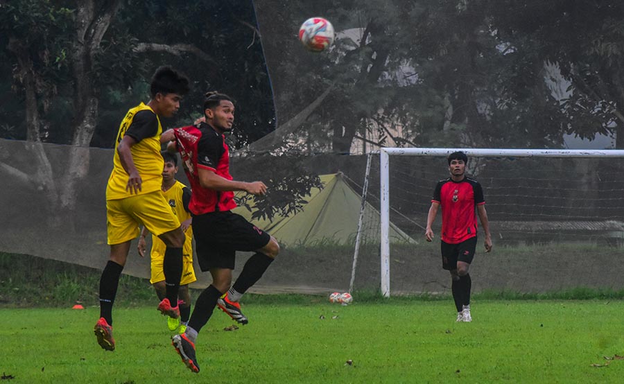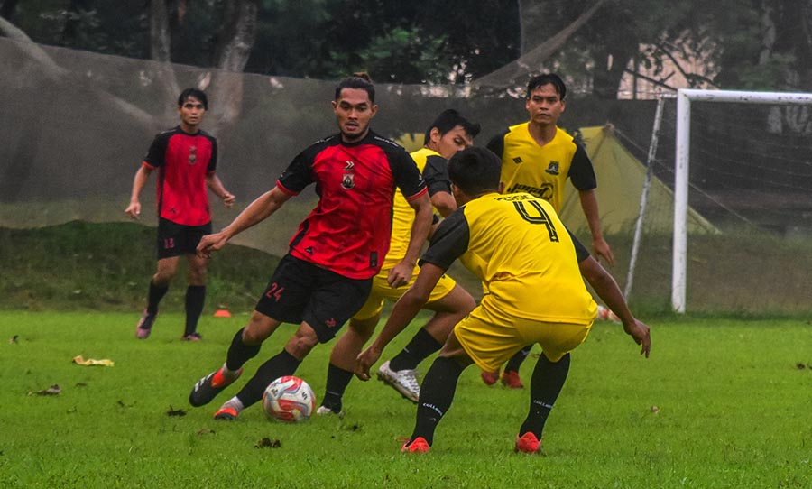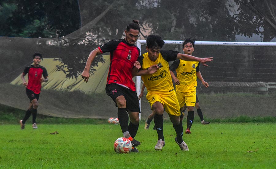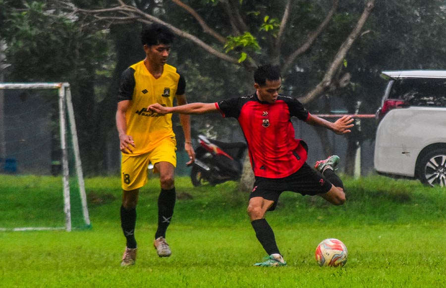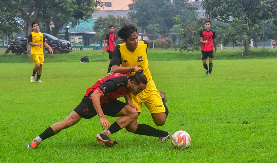 Persikota Tangerang (kostum merah) dan Persic Cilegon (kostum kuning) bertanding persahabat di lapangan Batalyon Arhanud Serpong, Kota Tangerang Selatan, Banten, Selasa (02/04/2024). Persikota Tangerang menggelar laga uji coba dengan Persic Cilegon dengan skor Persikota Tangerang 0 dan Persic Cilegon 1. Foto : Ilham Hedra Fauzi/LENSABANTEN