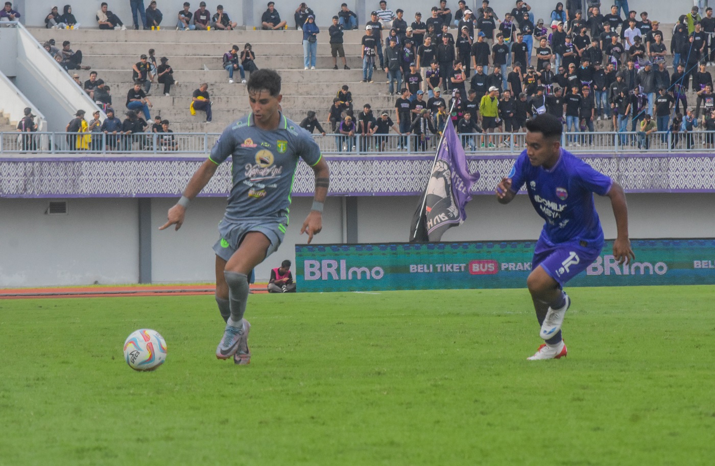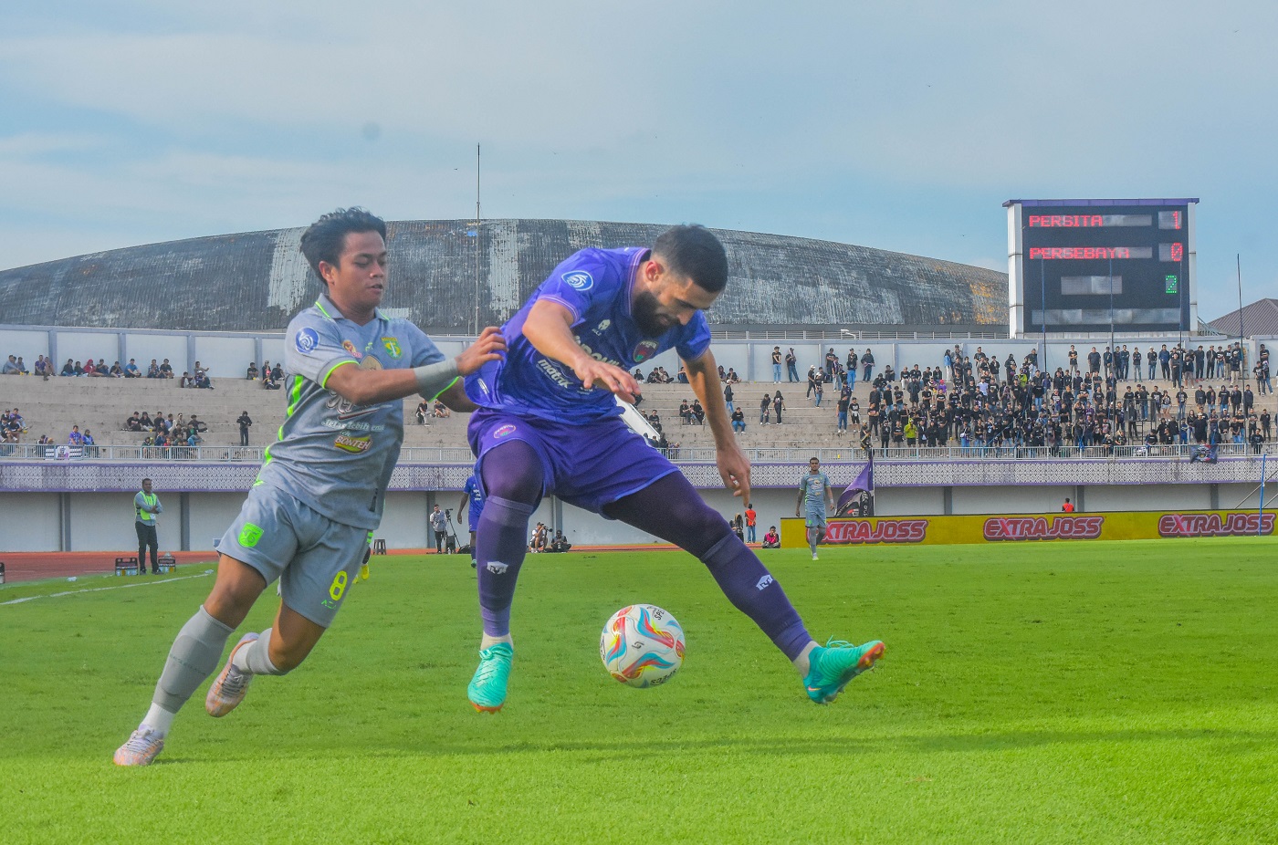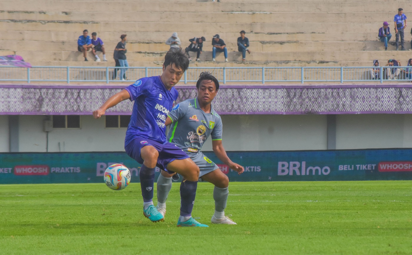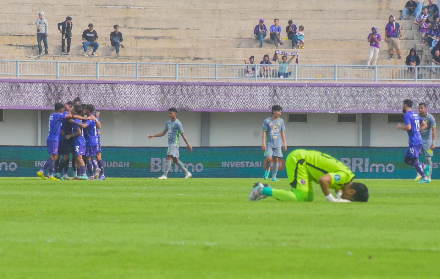 Tim sepak bola Persita Tangerang melawan Persebaya Surabaya di Stadion Indomilk, Jalan Raya Legok, Karawaci, Bojong Nangka, Kecamatan Kelapa Dua, Kabupaten Tangerang, Banten, Jumat (23/02/2024). Dalam pertandingan ini Persita sempat unggul lebih dulu namun Persebaya berhasil mengejar sehingga skor berakhir dengan 1 – 1. Foto : Ilham Hedra Fauzi/LENSABANTEN