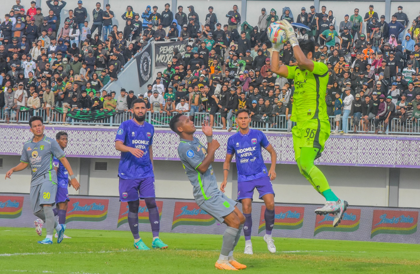 Kiper dari Persita Tangerang menangkap bola dari lawan Persebaya Surabaya di Stadion Indomilk, Jalan Raya Legok, Karawaci, Bojong Nangka, Kecamatan Kelapa Dua, Kabupaten Tangerang, Banten, Jumat (23/02/2024). Dalam pertandingan ini Persita sempat unggul lebih dulu namun Persebaya berhasil mengejar sehingga skor berakhir dengan 1 – 1. Foto : Ilham Hedra Fauzi/LENSABANTEN