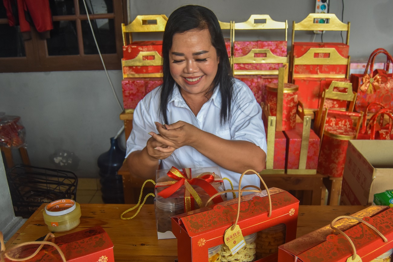 Pekerja membuat kue khas Imlek di Industri Rumahan Dhea Cake milik Ci Anna di Jalan Karyaman Raya, Rt 005 Rw 01, No 24, Kecamatan Tangerang, Kota Tangerang, Banten, Rabu (31/01/2024). Menjelang Imlek 2024 permintaan kue kering khas imlek seperti lapis legit, kastangel nastar, lidah kucing dan lainnya ramai di pesan, bahkan dalam bentuk hampers khas Imlek. Foto : Ilham Hendra Fauzi/LENSABANTEN