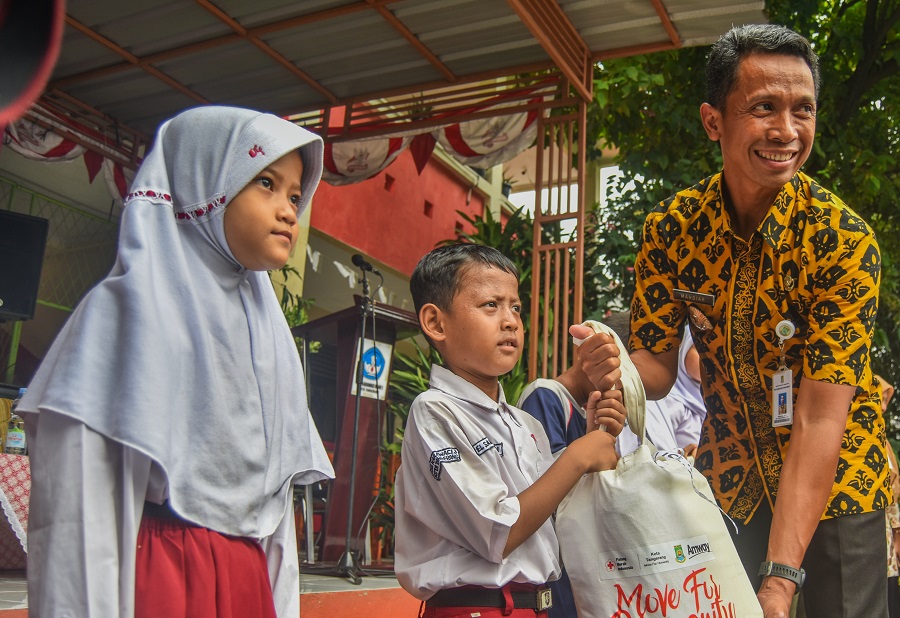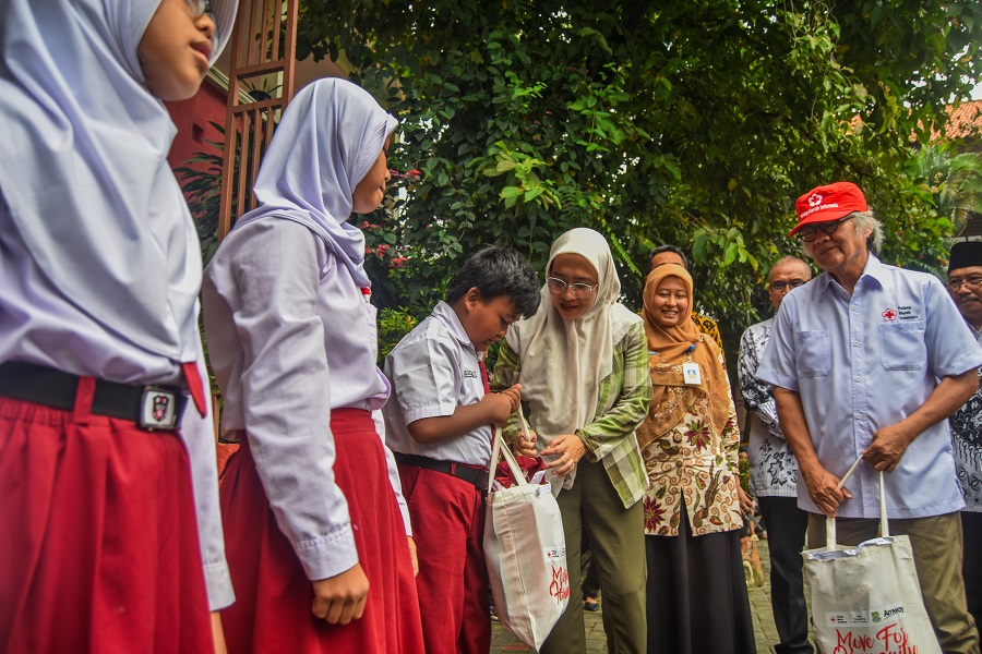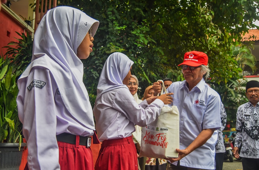 Ketua PMI Kota Tangerang Oman Djumansyah saat memberikan bantuan peralatan sekolah di SDN Karawaci Baru 1, Kecamatan Karawaci, Kota Tangerang, Banten, Rabu (25/04/2024). PMI Kota Tangerang bersama AMWAY Yayasan Peduli memberikan bantuan peralatan sekolah dari Sepatu, Tas, Seragam, dan Alat tulis sebanyak 200 Paket Kepada siswa yang kurang mampu. Bantuan ini tertuju kepada siswa SD yang kurang mampu, dalam lingkup Kecamatan Karawaci. Foto : Ilham Herda Fauzi/LENSABANTEN