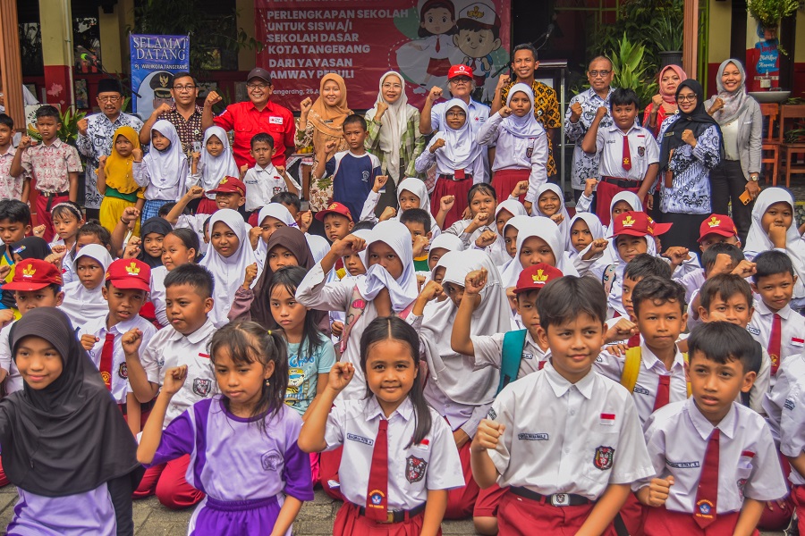 Murid penerima bantuan peralatan sekolah di SDN Karawaci Baru 1, Kecamatan Karawaci, Kota Tangerang, Banten, saat berfoto bersama, Rabu (25/04/2024). PMI Kota Tangerang bersama AMWAY Yayasan Peduli memberikan bantuan peralatan sekolah dari Sepatu, Tas, Seragam, dan Alat tulis sebanyak 200 Paket Kepada siswa yang kurang mampu. Bantuan ini tertuju kepada siswa SD yang kurang mampu, dalam lingkup Kecamatan Karawaci. Foto : Ilham Herda Fauzi/LENSABANTEN