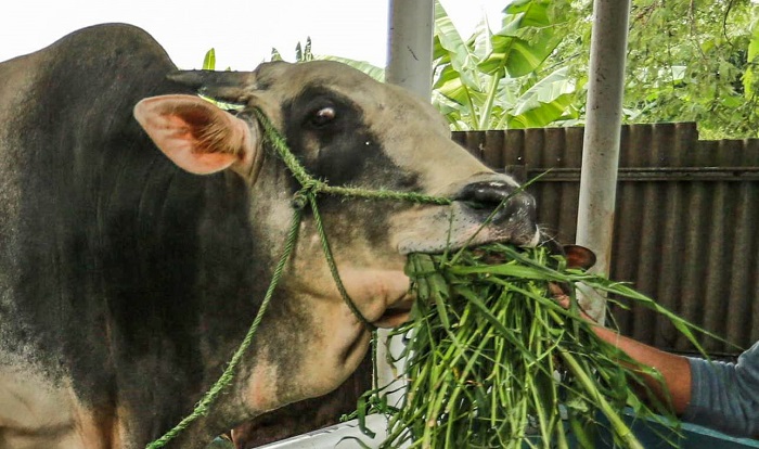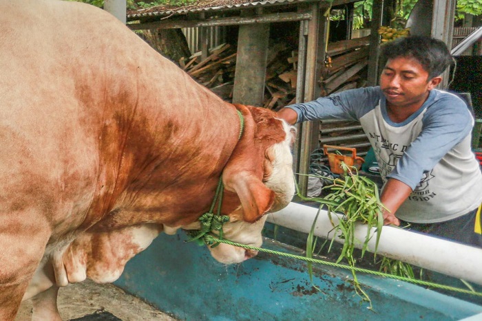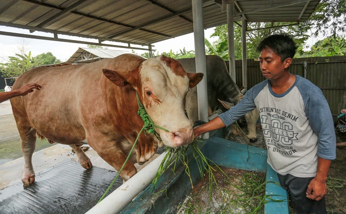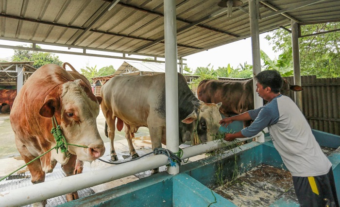 Peternak memberikan rumput kepada sapi milik Presiden Prabowo Subianto di peternak Putra Bungsung Neroktog, Kota Tangerang, Banten, Minggu(18/5/2025). Presiden Prabowo Subianto membeli dua ekor sapi jenis simental dengan berat 1,1 ton dan brahman dengan berat 950 kg seharga 180 juta rupiah. Kedua sapi dipilih Presiden untuk disembelih pada Hari Raya Idul Adha 1446 H di Provinsi Banten. Foto : Ilham Herda Fauzi/LENSABANTEN